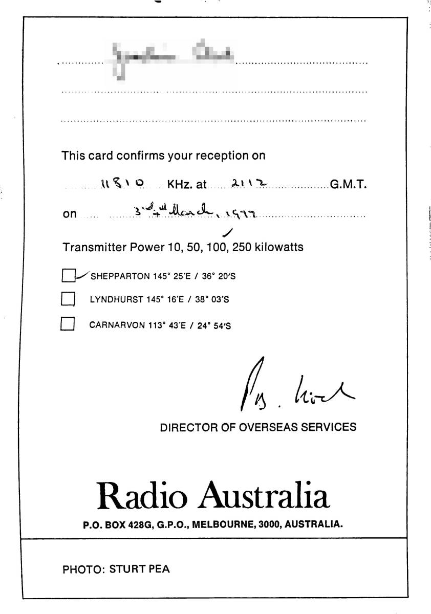 【商品名】・・・RADIO AUSTRALIA(★ラジオ・オーストラリア)のベリカード。 【国名・地名】・・・オーストラリア★メルボルン。 【受信データ】・・・1977年3月3日・SW11810KHZを受信。 【記載事項】・・・受信データ・受信者の氏名が記載。 【コメント】・・・かつて日本語放送を行っていた事はあまりにも有名ですね! 【状態】・・・シワ、汚れ、シミ、焼け、色あせ等があります。 ■カードの状態は★画像を参考に判断して下さい。 ■この機会にぜひこのベリカードを貴方のBCLコレクションに加えて下さい! 【おまけ】・・・YAESU★八重洲無線★取扱説明書(PDF版)1機種を無料で添付します。 ★通信型受信機★FRG-50Bの取扱説明書。(★回路図付) ★CD-Rに焼いてベリカードと一緒に同封致します。 ★PC閲覧やプリンターで印刷も可能です! | |
