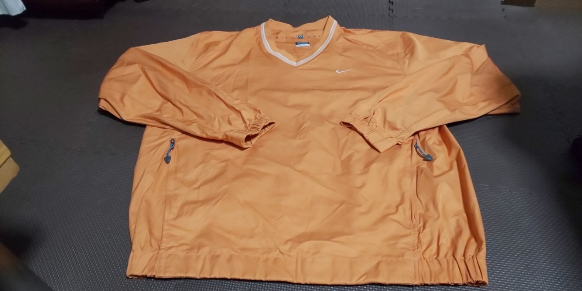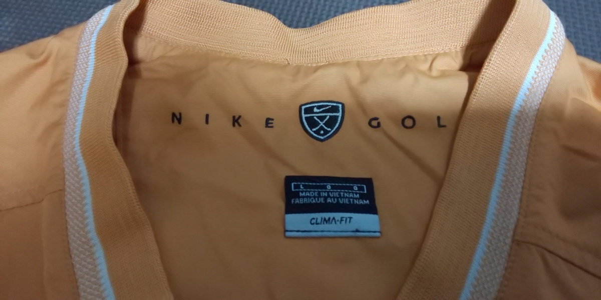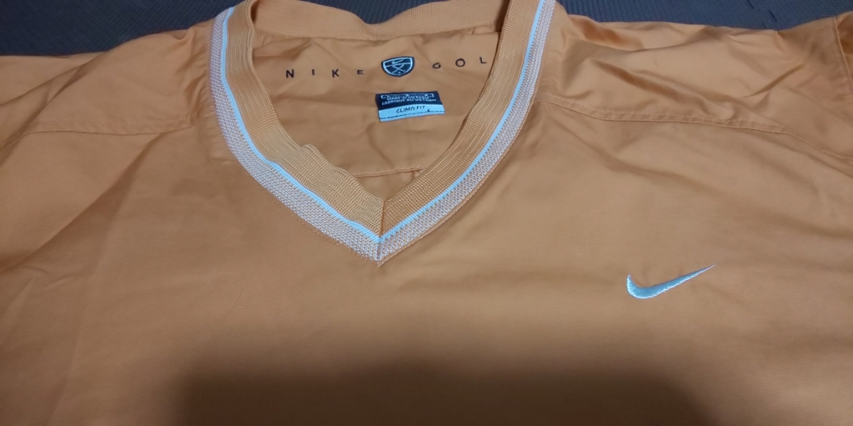 美品NIKEGOLF、Vライン、薄いオレンジ、ロゴ、ライン白、トップス