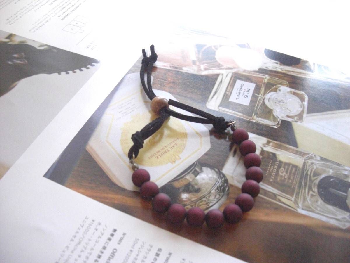 ハンサム・ガール・・シリーズです♪お気に入りの色使い・・シックなダークレッドの樹脂パールのブレスレットです♪マッ トな深い赤のパールに黒のスェード紐を合わせて甘すぎない大人のロマンチックしています♪ブレスレットは8ミリの丸玉です♪長さは全長28 センチ位で調節自由です♪お揃いのシリーズも出品しています♪ハンドメイドをご理解いただいてノークレーム・ノーリターンでお願いします♪