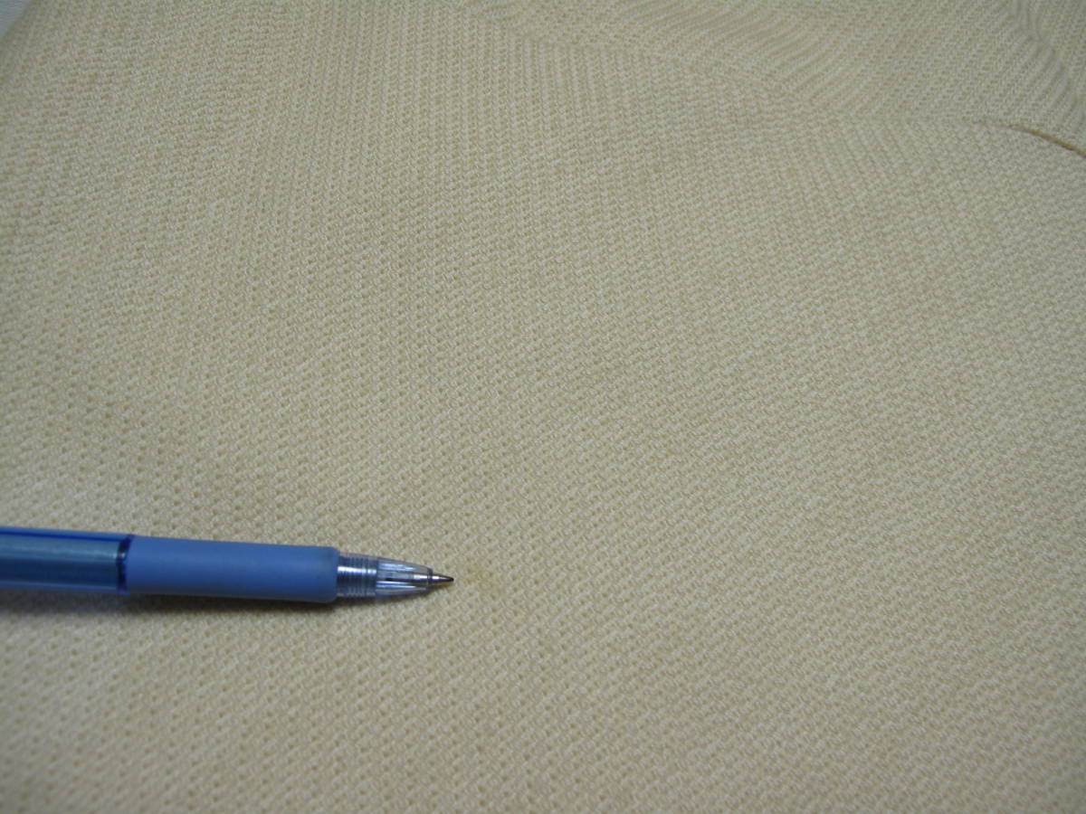2回短時間着用したのみですが、中央右寄りに薄いシミ(ペンの先の辺りです)があります。写真でご確認ください。