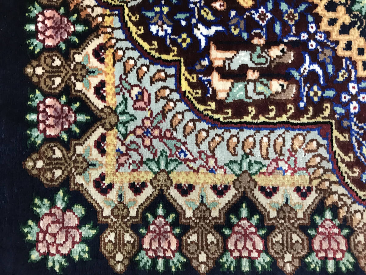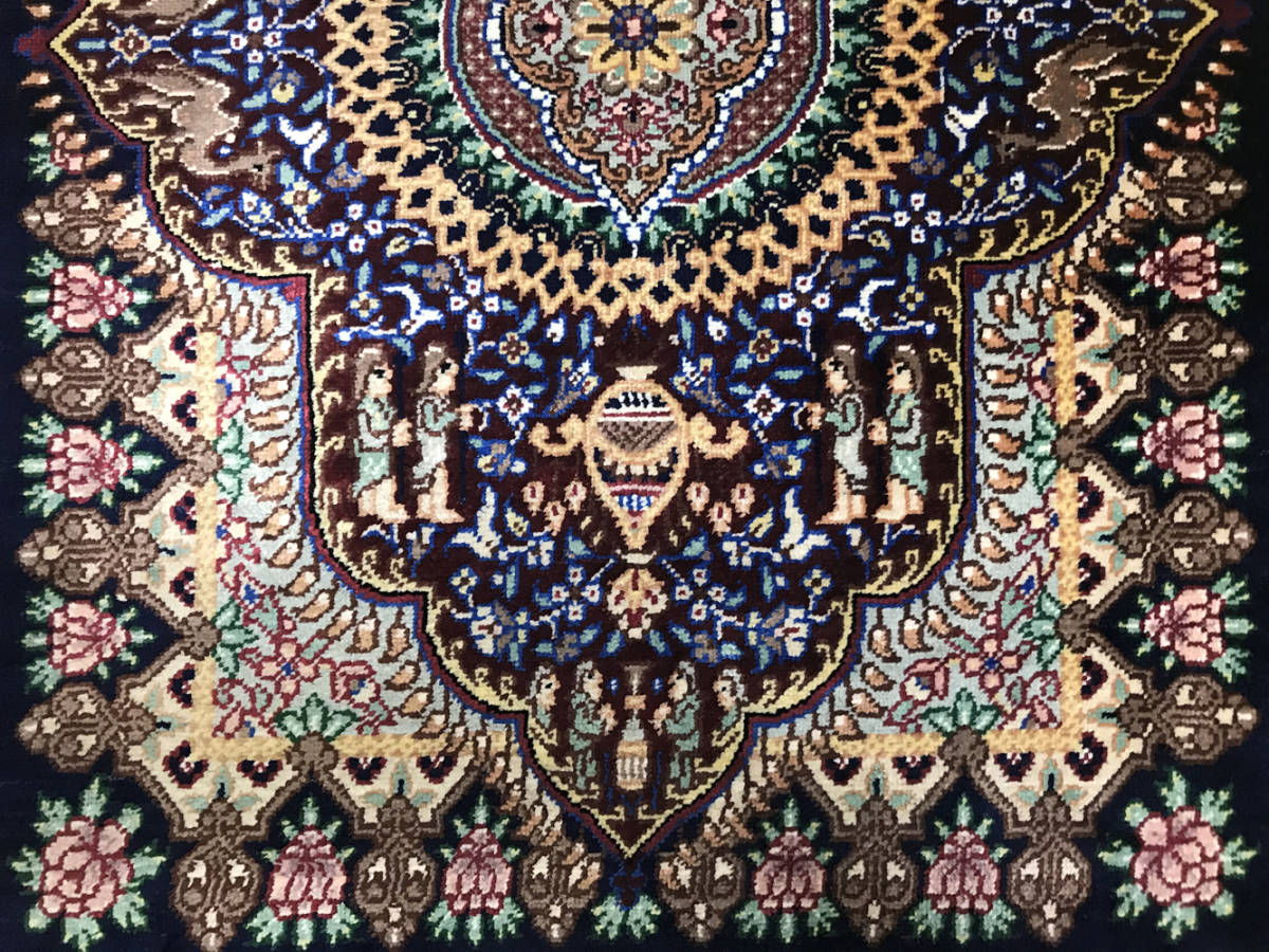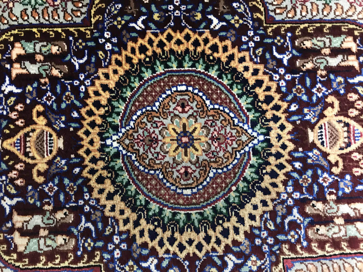 こちらの絨毯は、クム産の高級シルク100%の手織り絨毯です。