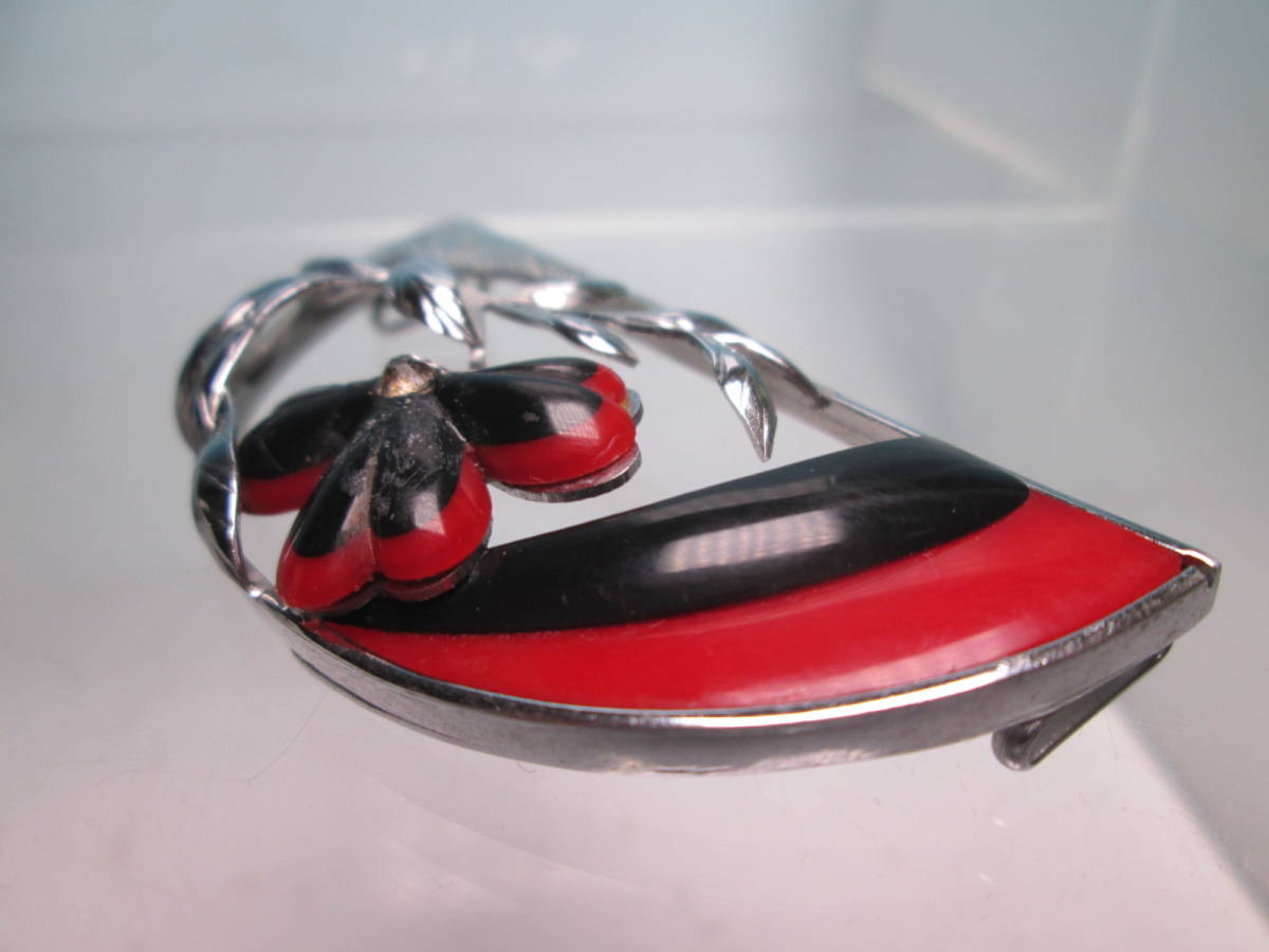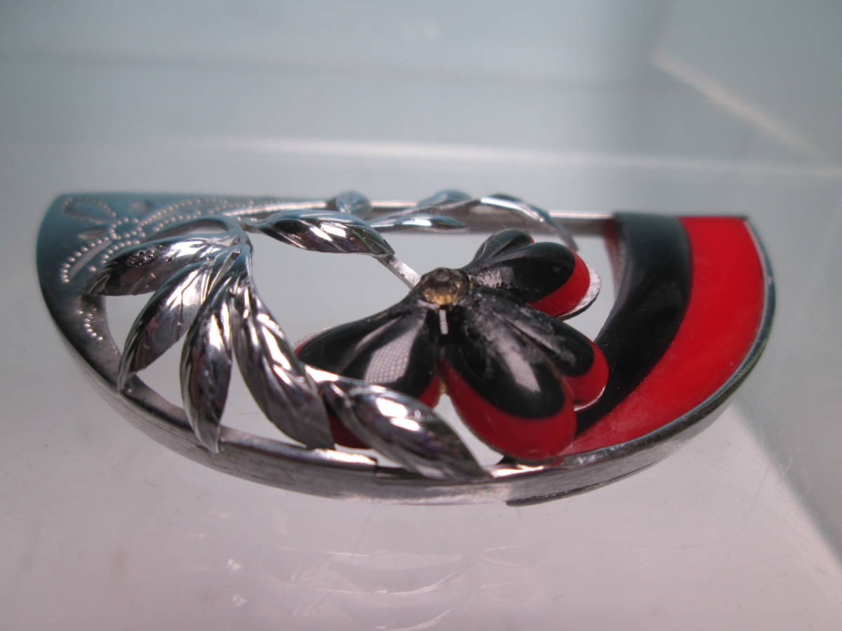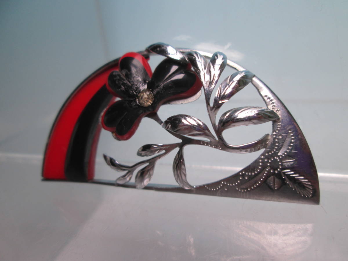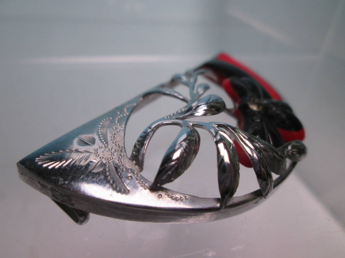 【江月】アンティーク・彫金細工 赤と黒配色の綺麗な花の帯留め 10,32g