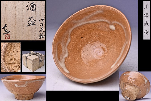 川淵直樹 ★ ワラ灰釉ぐい呑 ★ 共箱 栞 ★ 縁:小山冨士夫( 古山子 )★ 井戸を思わせる造形と釉景の上手作 ★ 酒器 ★ 川渕直樹 ★