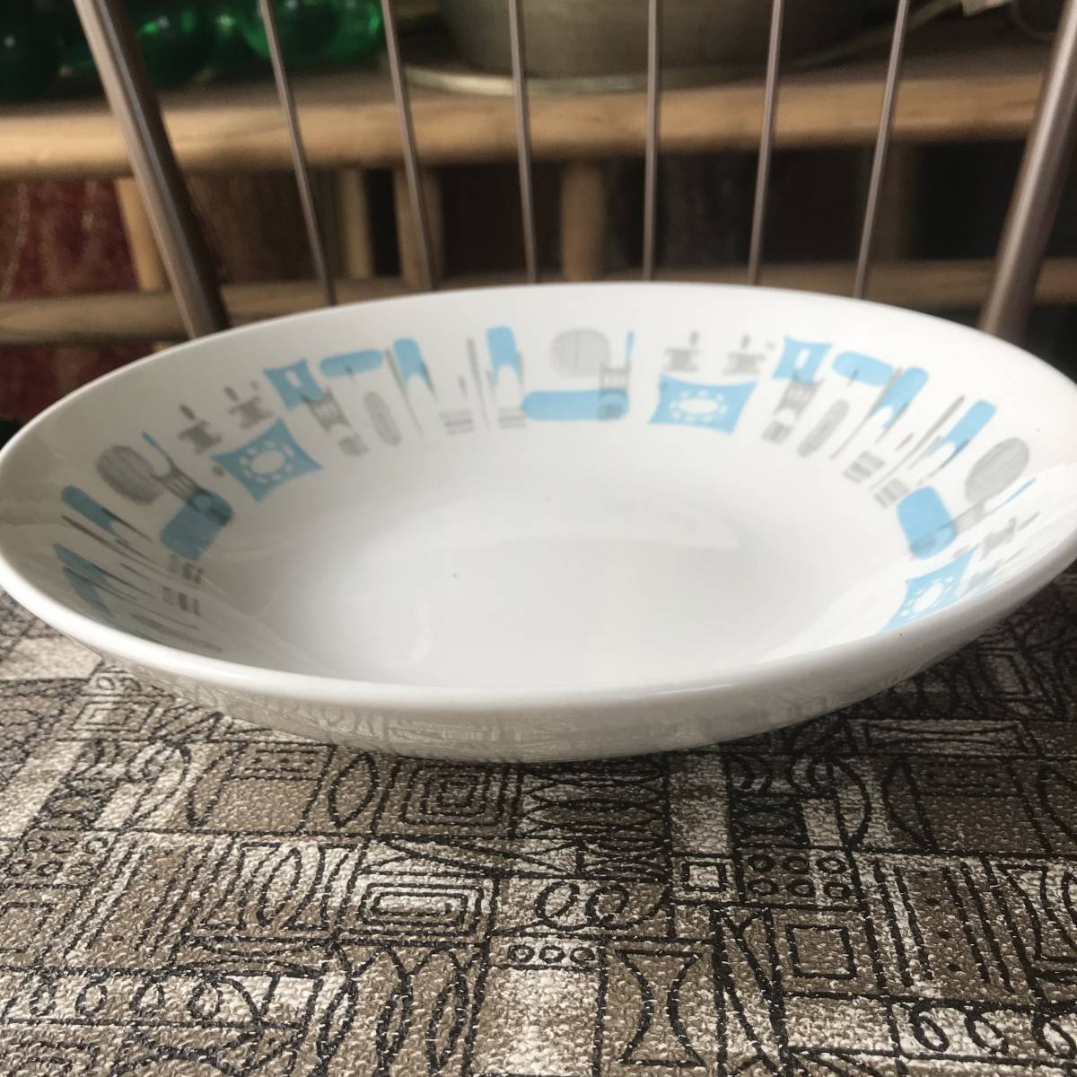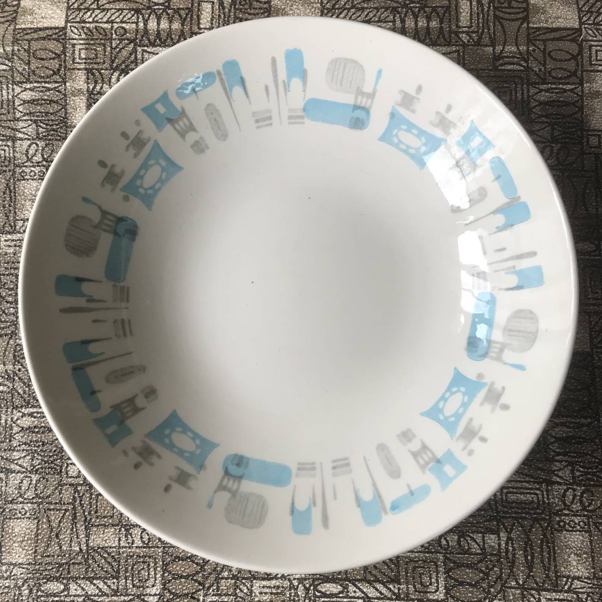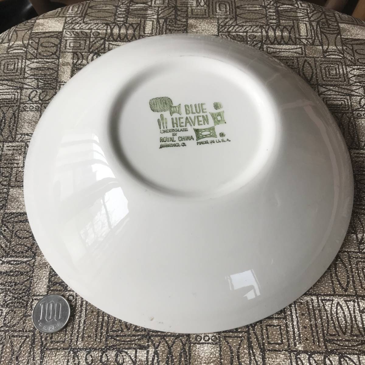 の食器になります。ブルーヘブン!アメリカミッドセンチュリーの貴重な食器です。サイズは直径約22.5cm、高さ約5cm、一緒に写してる100円玉と比較参照して下さい。カケやヒビなどはなく程度は良好です。古いものですので神経質な方はお控え下さい。ビンテージにご理解ある方 よろしくお願いします。