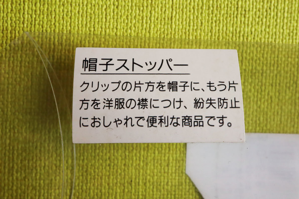 帽子ストッパー。帽子クリップ。 風の強い日や自転車でお出かけの日に重宝です。 クリップの片方を防止に、もう片方を洋服の襟につけ、お使いください。 紛失防止におしゃれで便利な商品です。 ◆メーカー希望小売価格(税抜き):¥1500 | |||||||||||||