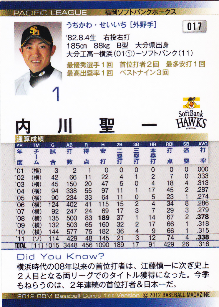 2012BBMベースボールカード1st 017 内川聖一 ソフトバンク 大分県 大分工業高校 横浜 ドラフト1位