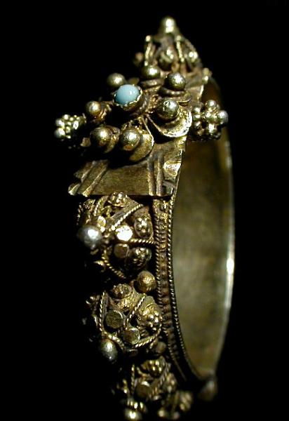 スマトラ島南部のパレンバン近辺で、かつて身分の高い人々の間で腕輪として使用されていたものです。推定でおよそ120-150年前に製造されたものです。銀の含有量は825、残りは銅。サイズは、内直径が約5.4cm、最大直径が約8cm。厚みはおよそ1.7cm。重さは約66グラム。水色の石が一粒付いていますが、何の石かは定かでありません。また、開閉はネジ形式です。