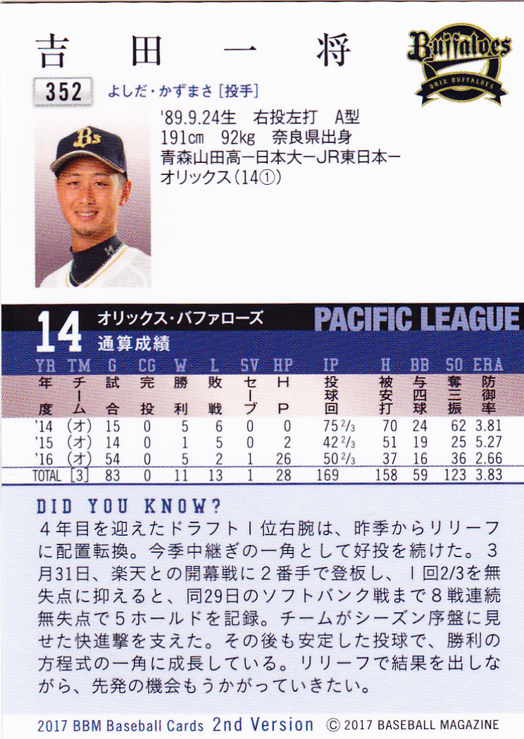 BBM2017ベースボールカード2nd 352 吉田一将 オリックス 奈良県 青森山田高校 日本大学 ドラフト1位