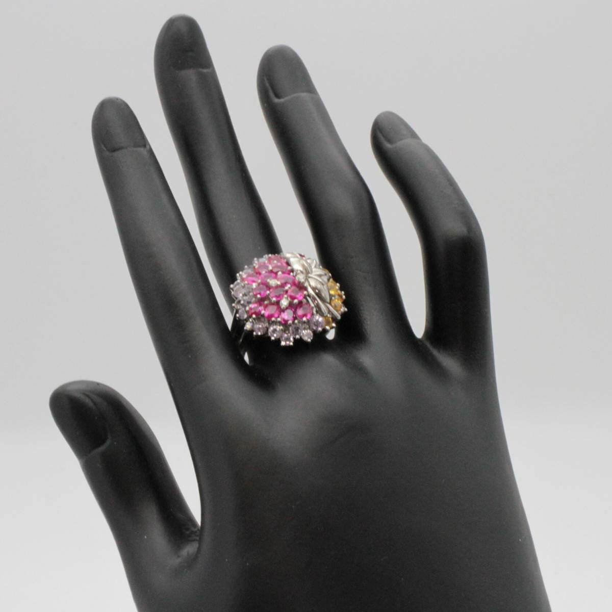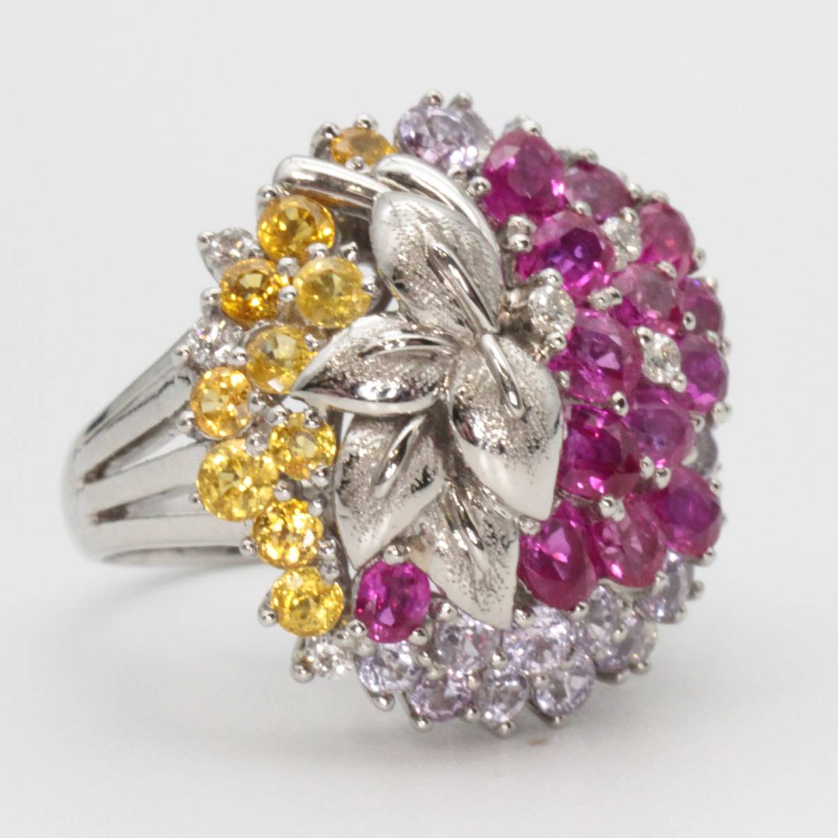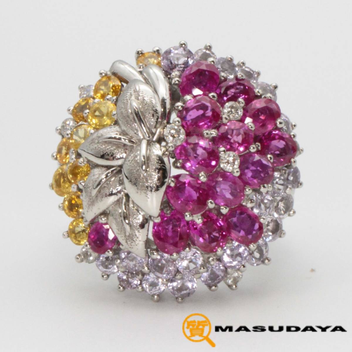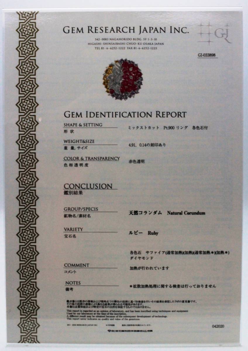 ◆商品説明◆ | 【素材】 ・Pt900 ・コランダム4.91ct (ルビー、ピンクサファイア、イエローサファイア) ・D0.14ct 【寸法】 リングサイズ12.5号 【重量】 15.6グラム 【付属品】 ・GRJ鑑別書 ・リングケース 【商品状態】 未使用展示品 【コメント】 ・ジェムリサーチジャパン(GRJ)鑑別書付きです。 ・鑑別書は2つに折り曲げての発送になります。 ・赤色ルビー、黄色イエローサファイア、ピンクピンクサファイア、とダイヤモンドの4色の色が入っております。 |