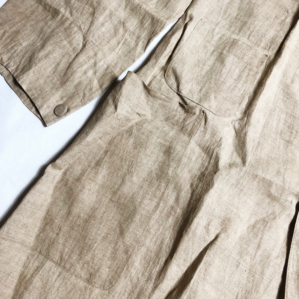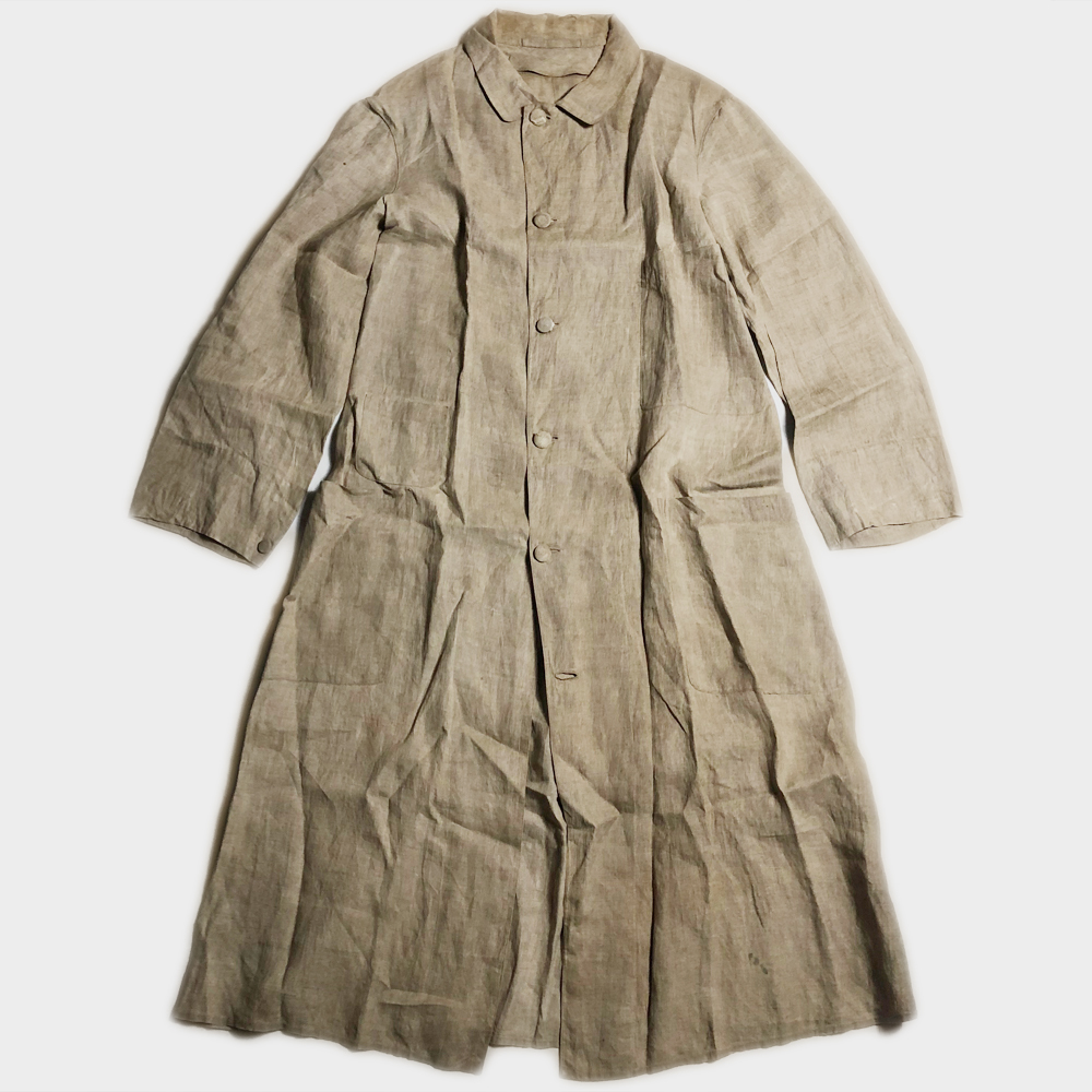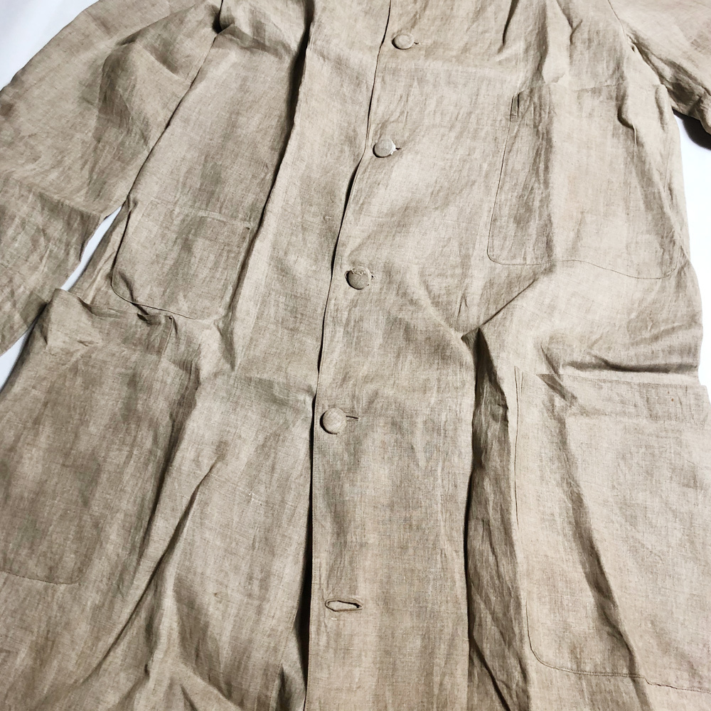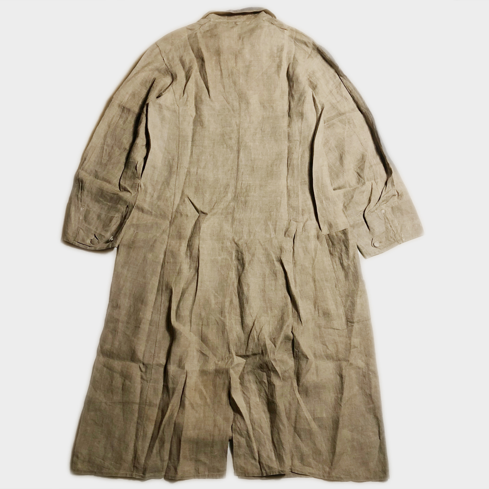 杢調のベージュカラーで、所謂ダスターコートと呼ばれる形。ダスターコートとは砂ぼこりから身を守る清掃員が着用していたアウターのことで、こちらの様なリネンタイプは春先向けの為、汚れが目立たない様ベージュや生成りの物が主流な様です。