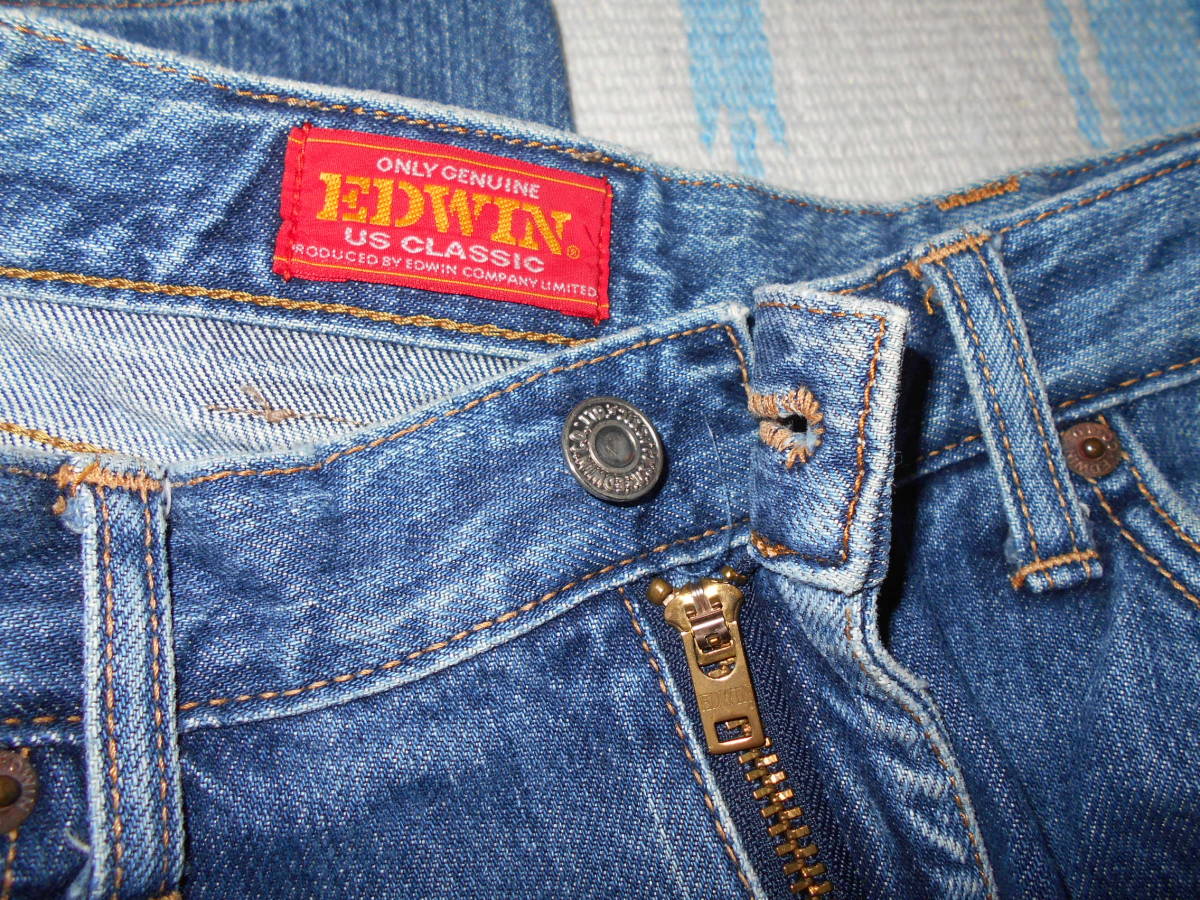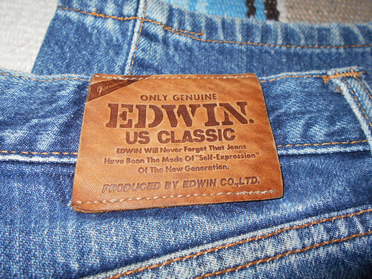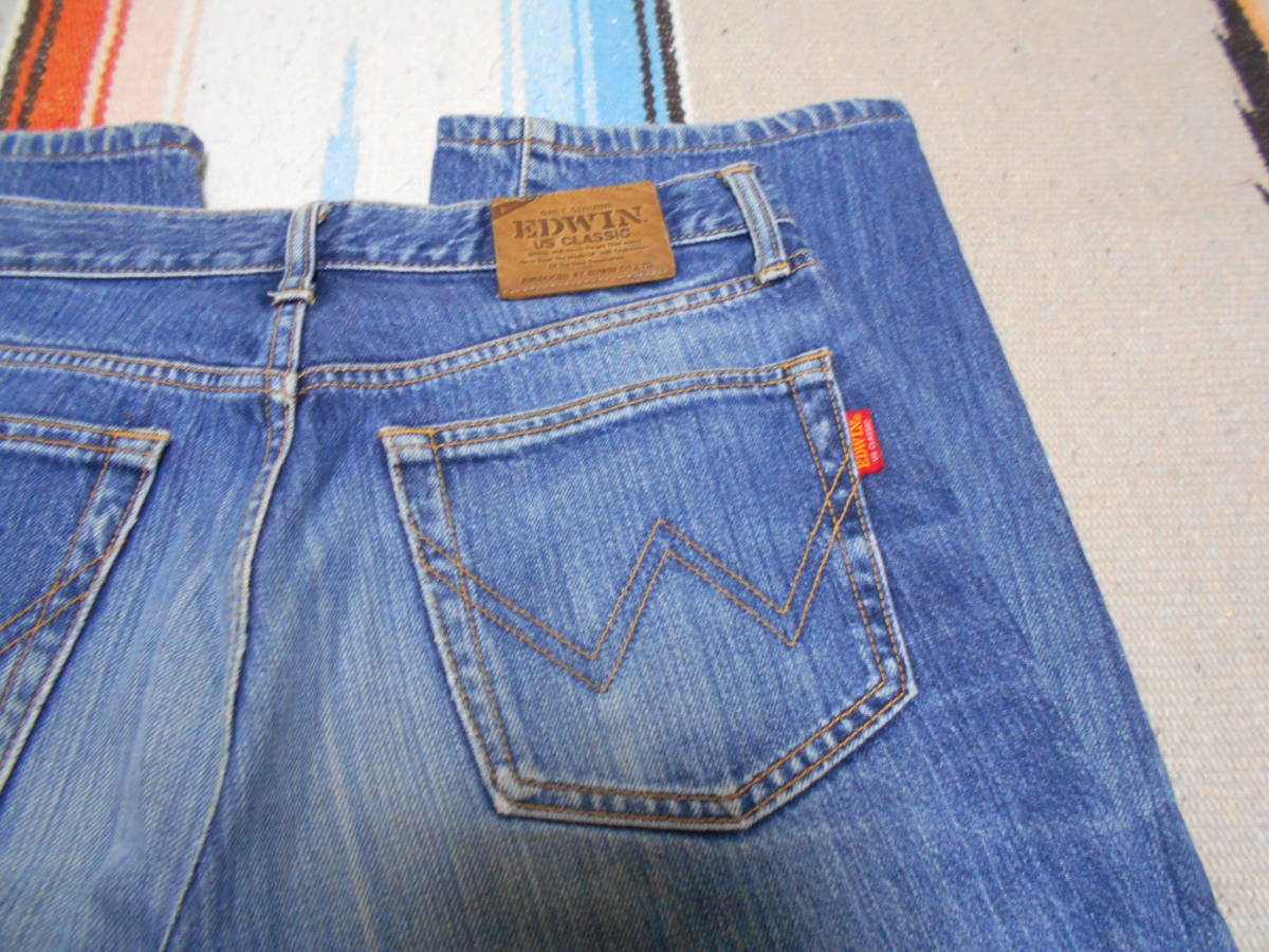 「EDWIN」 US CLASSIC 特有 ビンテージ縦色落ちインディゴデニム素材、随所の縫製やリベット補強の細部までしっかりした作り MADE IN JAPAN