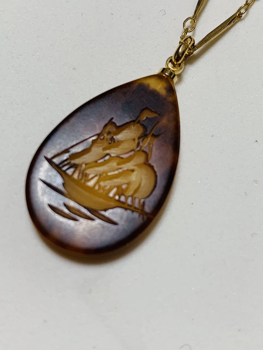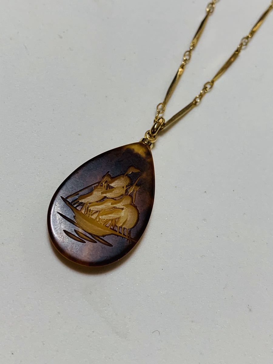 鼈甲張、船の絵模様のペンダントネックレスです、トップのサイズは30×18ミリ、チェーンはゴールドカラー、変わりチェーンで41センチで、美しいネックレスです