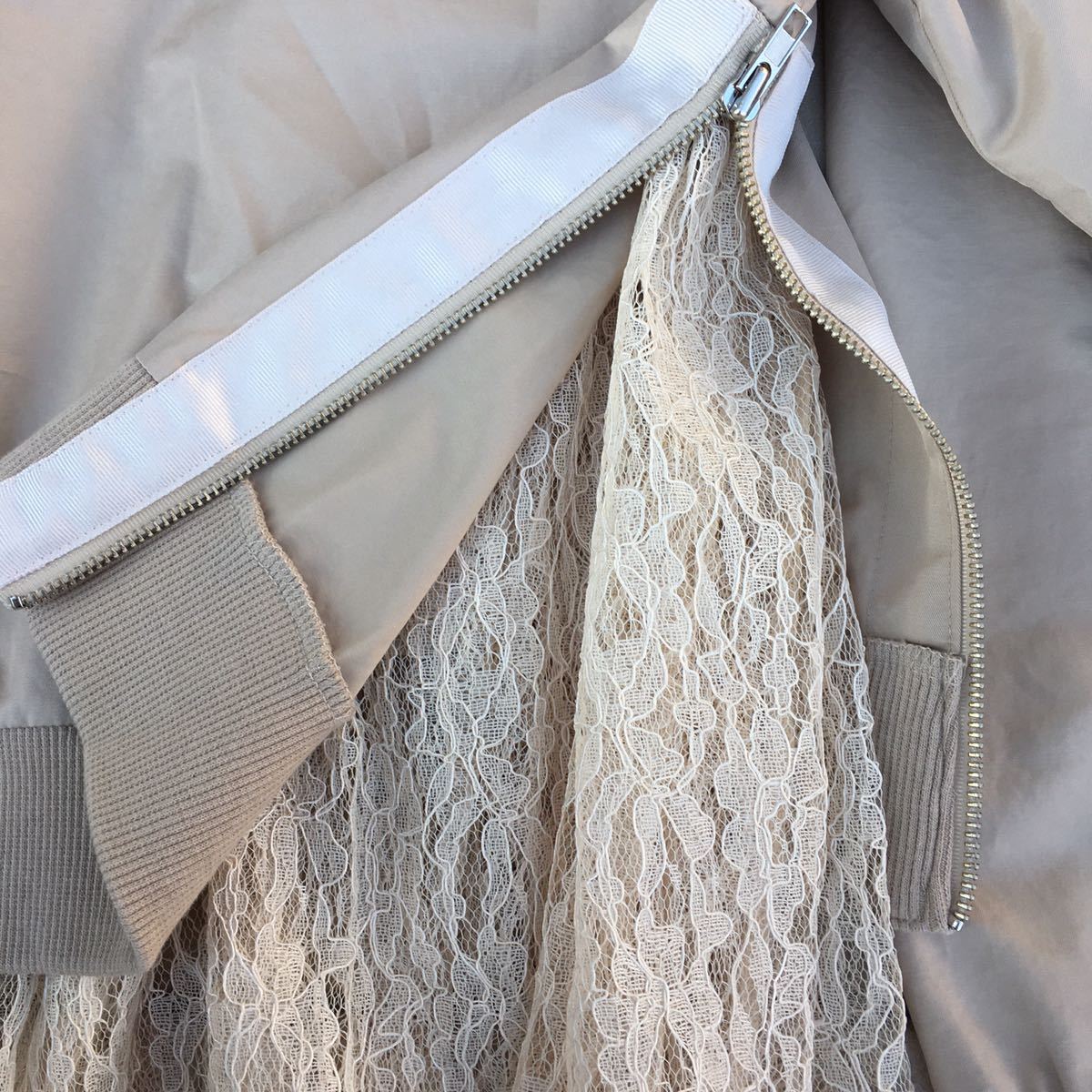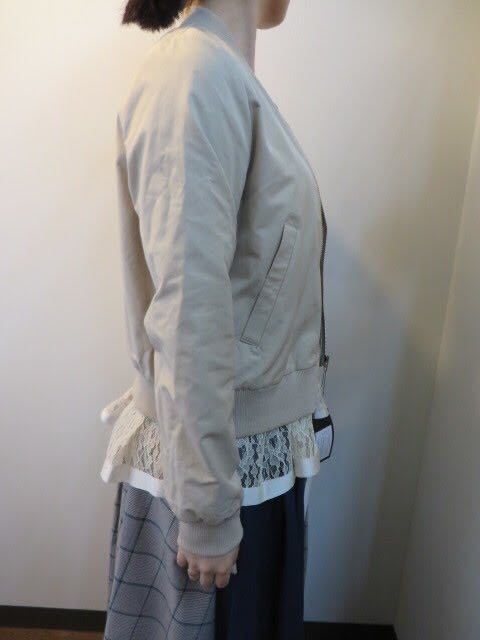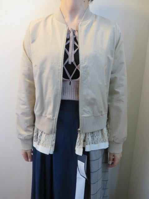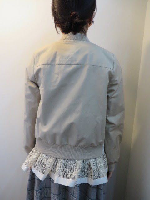 マットなツヤのあるしっとりとした素材と、裾から覗くレースの組み合わせが、ブルゾンのカジュアルさを抑え大人かわいい雰囲気に。