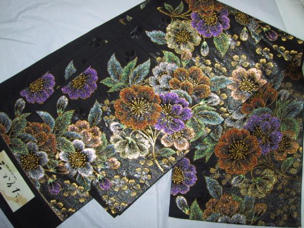 京都西陣 じゅらく の 若向きよう(振袖、訪問着、付け下げ、無地、小紋、など向き)のTOPブランド品『花かるた(花かおり)』ブランドです。6通柄袋帯 新品未仕立て品、絹100%金属糸等使用  黒地の生地に耀変?、 はな、、
