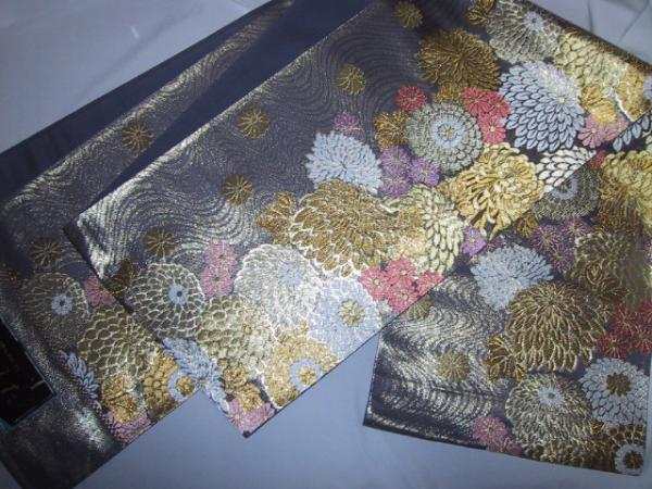 京都西陣 じゅらく の 若向きよう(振袖、訪問着、付け下げ、無地、小紋、など向き)のTOPブランド品『花かるた(花かおり、)』ブランドです。6通柄袋帯 新品未仕立て品、絹100%金属糸等使用   暗紫灰色のの生地に きく、、、
