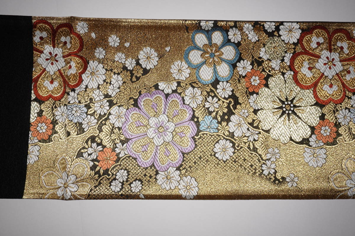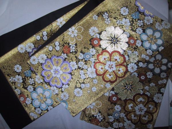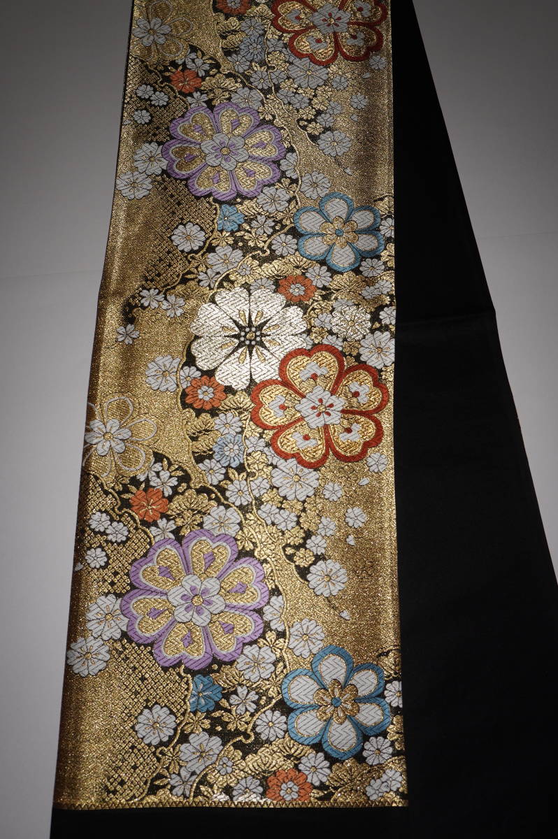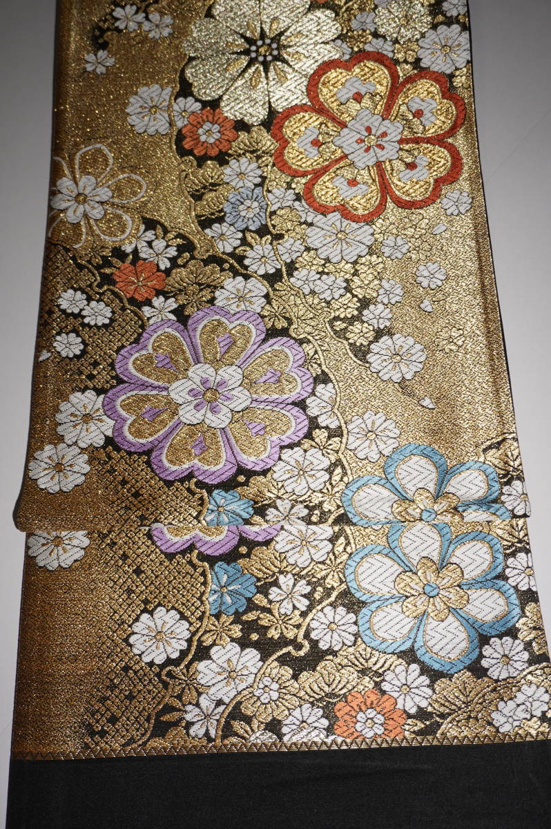 黒金+金地(裏地はくろ)かいきり(たれ先柄立ち上がり)~かいきりなし(手先柄はし)まで約453,5cmですので、出来上がり予想は約448cmです。巾31,0cm1738え