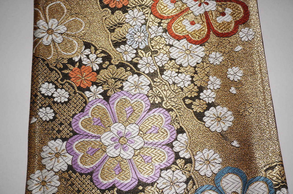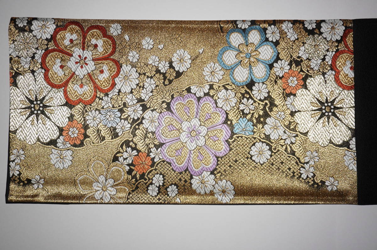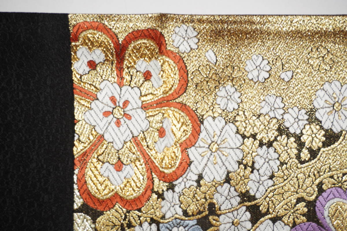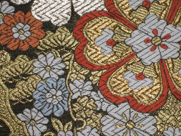黒金+金地(裏地はくろ)かいきり(たれ先柄立ち上がり)~かいきりなし(手先柄はし)まで約453,5cmですので、出来上がり予想は約448cmです。巾31,0cm1738え