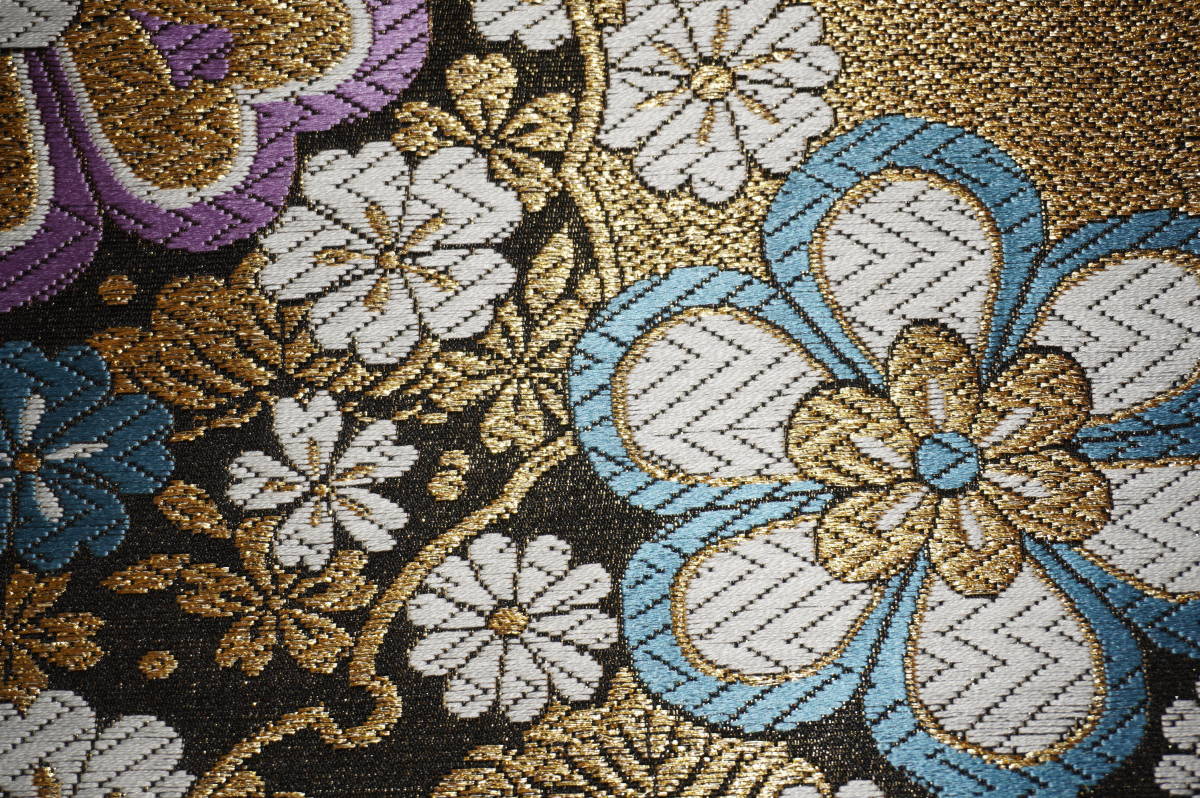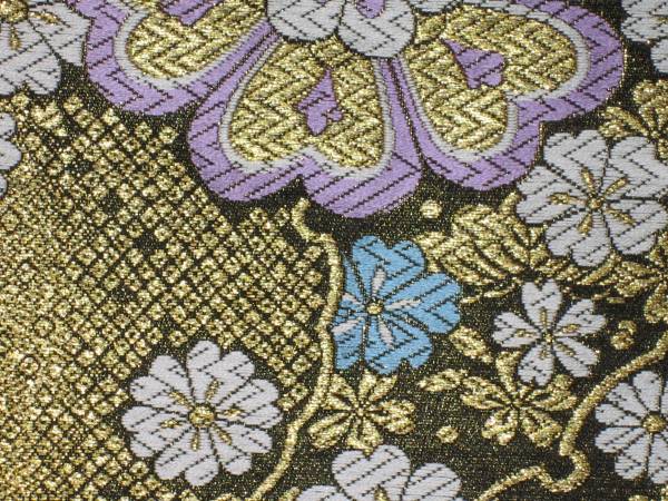 なお、帯柄左上に無地で出ているところは裏無地、たれ、中無地(手先と前太鼓のあいだの無地部分)、太鼓部、前腹部となります。六通柄です。金銀糸が多用されている場合ストロボの照りで、しろぽく写っている部分があります