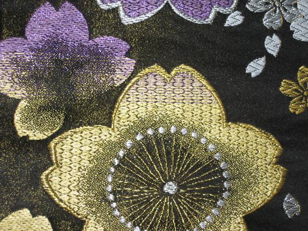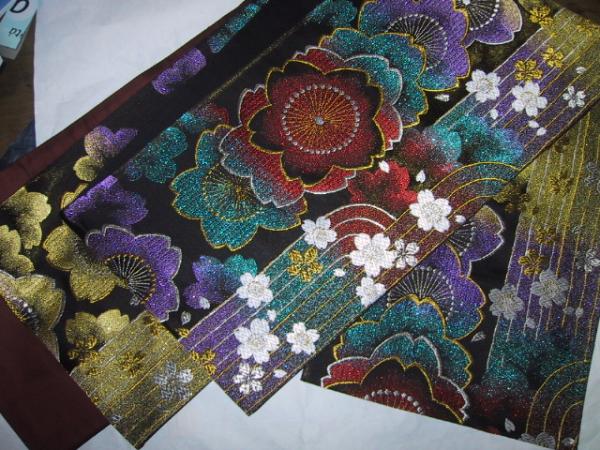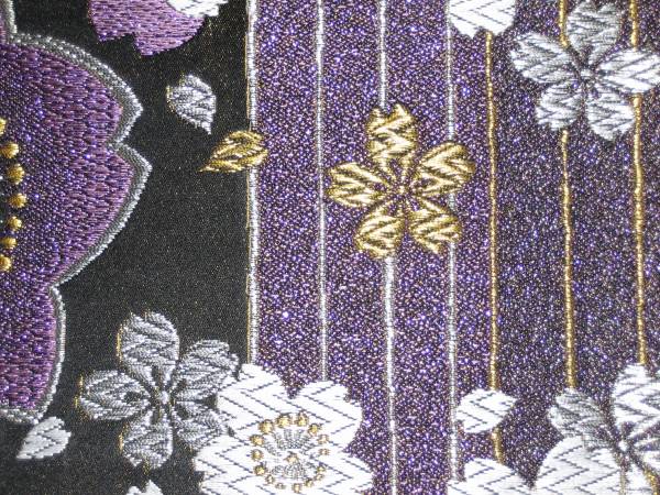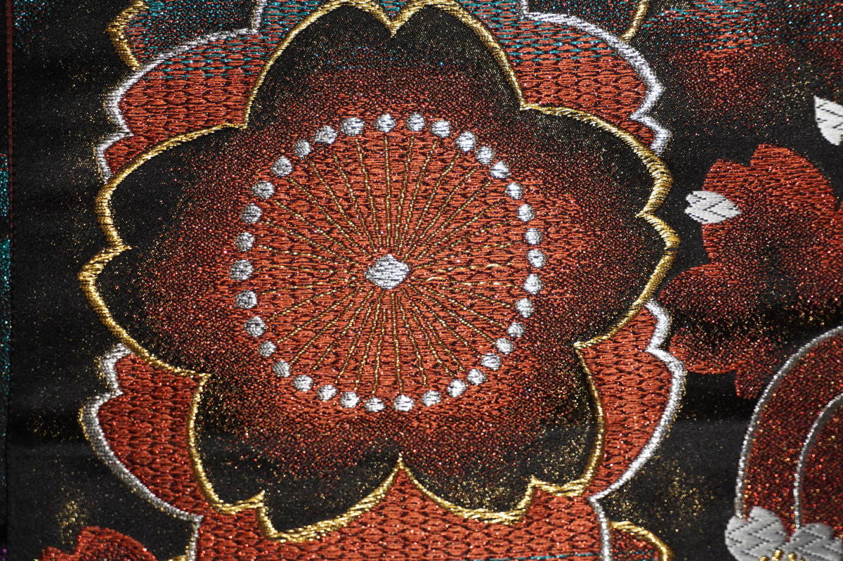 なお、帯柄左上に無地で出ているところは裏無地で、柄と柄の間に出ているところは手先と前太鼓のあいだの無地部分です。六通柄です。金銀糸が多用されているためストロボの照りで、しろぽく写っている部分があります。