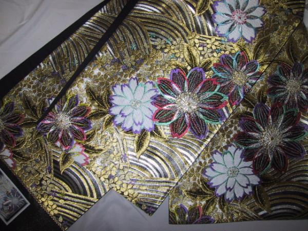 京都西陣 じゅらく の 若向きよう(振袖、訪問着、付け下げ、無地、小紋、など向き)のTOPブランド品『花かるた(花かおり)』ブランドです。6通柄袋帯 新品未仕立て品、絹100%金属糸等使用  くろ色のの生地に はなとなみ、、、
