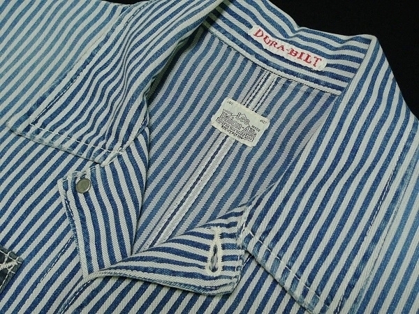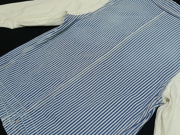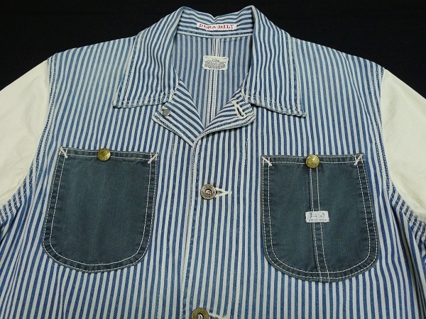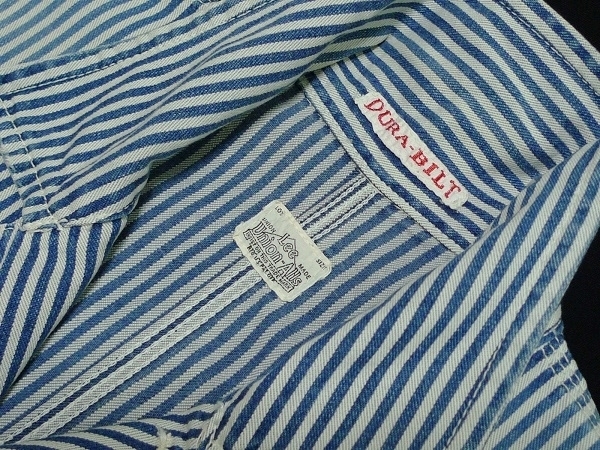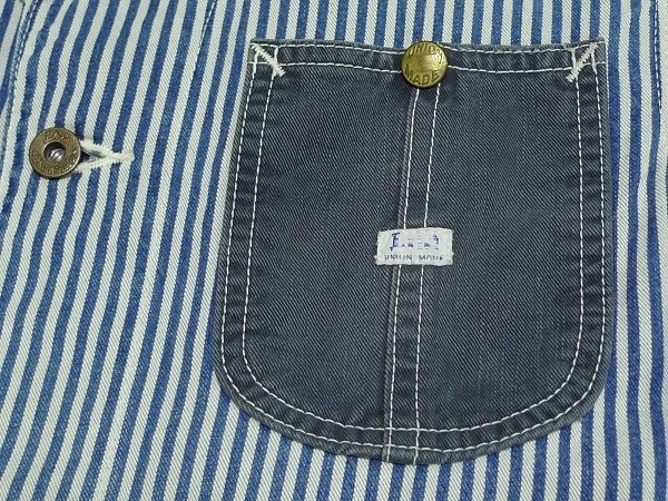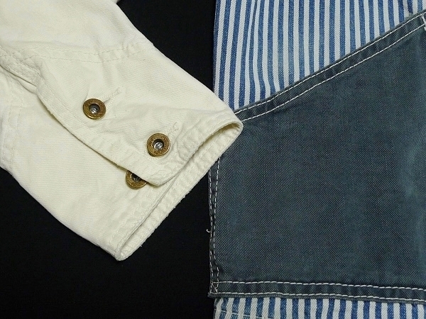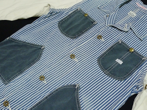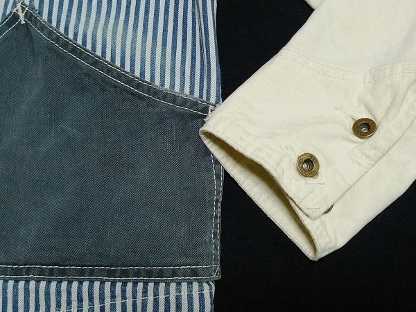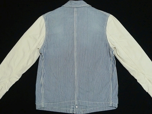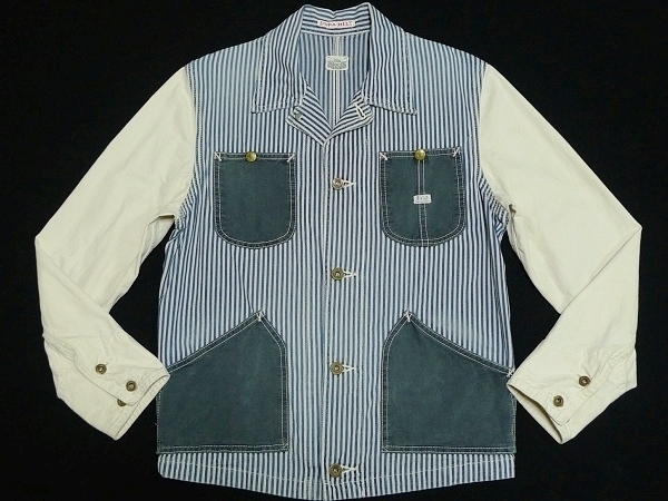 | 「Lee リー」のLeeSHOP限定販売となるワーク・ウェアの歴史的名品を現代的に再構築したモダナイズド・ヴィンテージ・シリーズの「Lee The UNIFORMS」シリーズの「DURA-BILT」タグを使用したヴィンテージ・スタイルのワーク・ジャケット「PATCH WORK COVERALL パッチ・ワーク・カバーオール」のサイズSMALL(36相当)になります。カラーはヒッコリーXナチュラルでヴィンテージな雰囲気に仕上げたユーズド・ウォッシュ加工が施されています。(LS1008-104、定価19,000円、税込み20,900円)。Lee・リーの代表的なワーク・ジャケットの「91-J LOCO JACKET」をベースにタイト&ショートなシルエットで現代的なフィット感で製作されたモダナイズド・ヴィンテージ・モデルのデニム・ワーク・ジャケットになります。素材はSANFORIZED加工(縮み防止)が施されたLeeのワーク・ウェア伝統の汚れの目立たないヒッコリー・デニムを身頃に袖にナチュラル・デニム(生成デニム)、ネイビー・デニムをポケットに使用、縫製はトリプル・ニードル・ミシンによるトリプル・ステッチ縫製、ボタン類はオールド・タイプの「Lee UNIONALLS」表記のドーナツ・ボタン、ポケットはフロントにパッチ・ポケットが4つ(胸ポケットとハンド・ポケット)、ラベルは「Lee SANFORIZED UNIFORM」表記の入るハウスマーク・ラベル(白・黒文字)、「DURA-BILT」タグ、胸に青文字「Lee」の白ピスネームが付きます(スレ加工)。ヴィンテージ・ユーズド加工が施されたモデルで長年着込んだ感じの色落ちに仕上げたウォッシュ加工やスリキレを再現したシェービング加工、腕など白地部分にも汚し加工が施されています。状態は元々ユーズド加工が施されたモデルで全体に使用感がある仕上がりになっています。全体的には使用感の少ないきれいな状態で、着用による襟まわりのスレや洗濯による色落ちなど若干の使用感がありますが着用による穴あきや破れ、袖口のほつれなどのダメージは無く、薄色ですが目につくようなシミや汚れも無く全体にダメージの無い非常に良い状態になると思います。実寸は肩幅約43cm、着丈(衿下より)約59cm、身幅(腋下で)約50cm、袖丈約60cmとなります。(素人採寸ですので多少の誤差はお許し下さい。)素材は綿100%。中国製。洗濯済み。3種類のデニムを組み合わせてヴィンテージ・スタイルで仕上げたお洒落なマルチ・カラーのワーク・ジャケットになります。 | |||