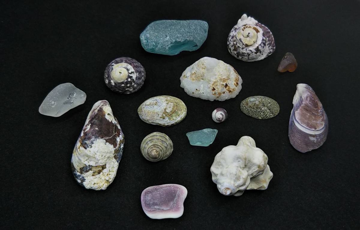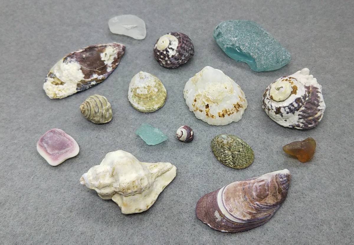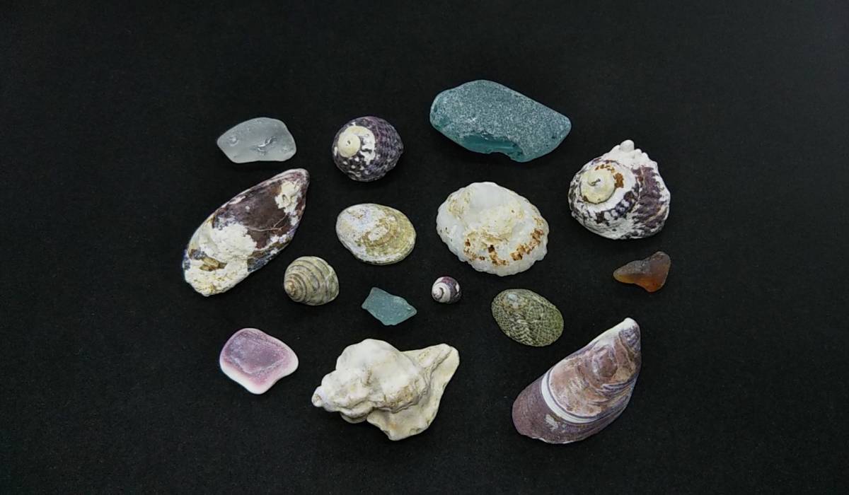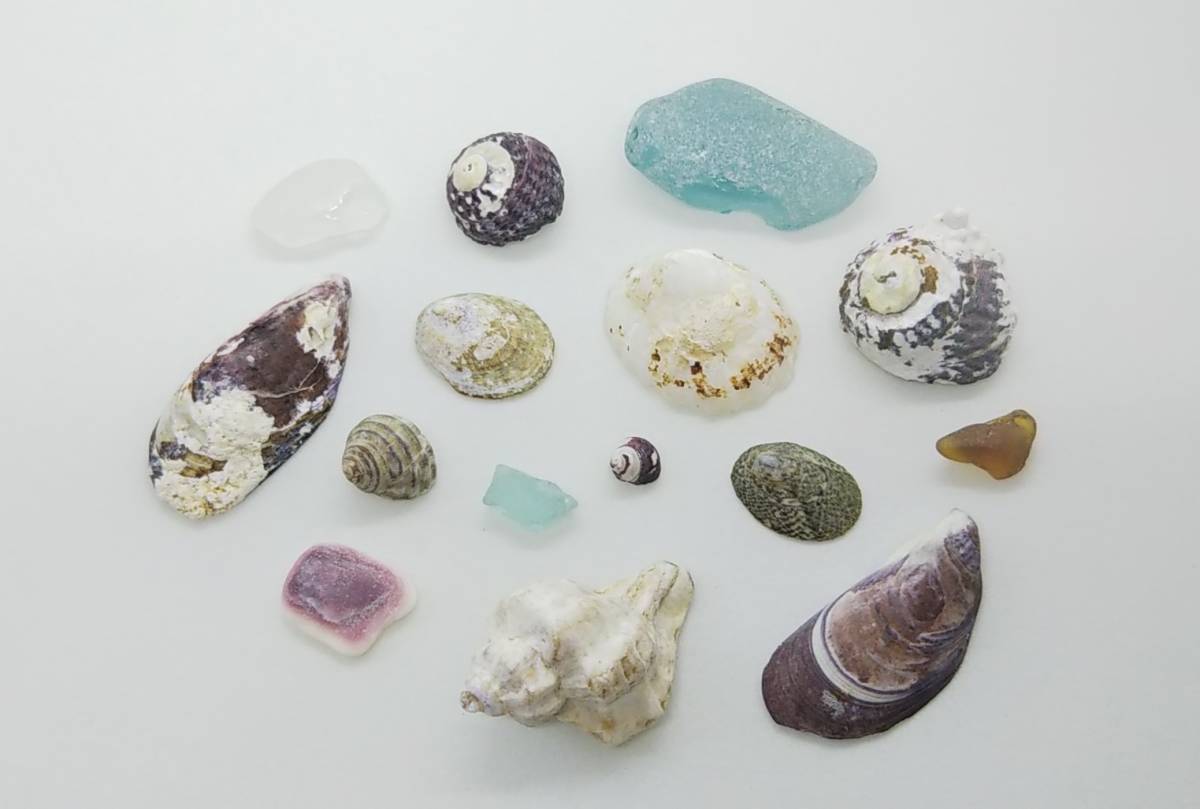 岩手県宮古市の浄土ヶ浜にて見つけた貝殻と波に洗われ味わいを増した漂流ガラス片です(1点は石かもしれませんがキレイなのでセットに含んでいます)
