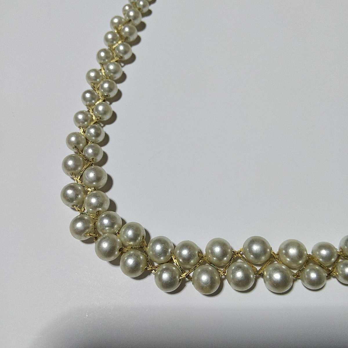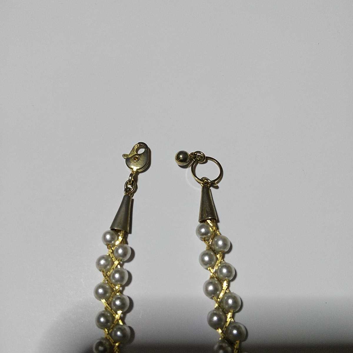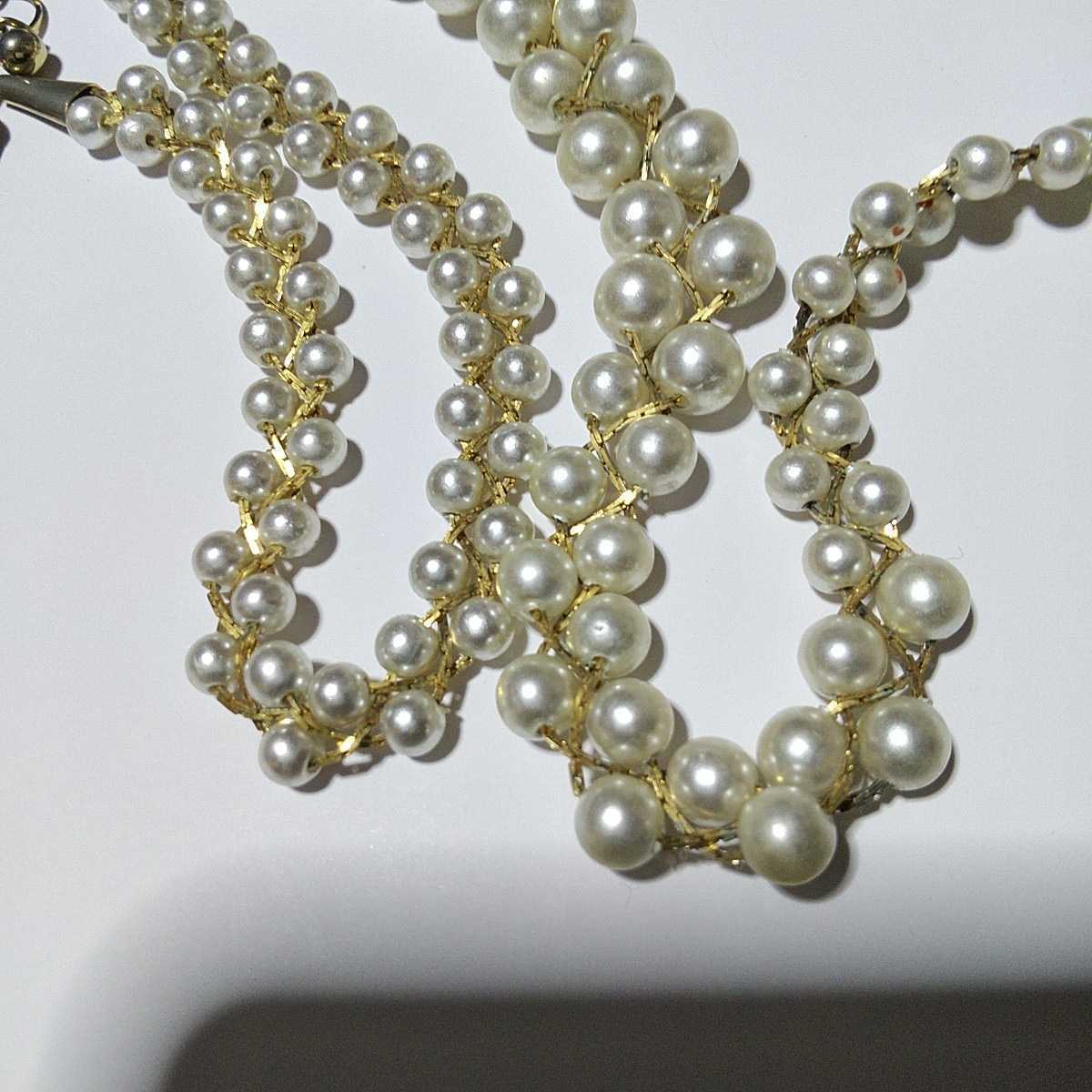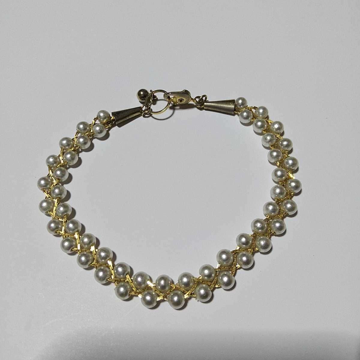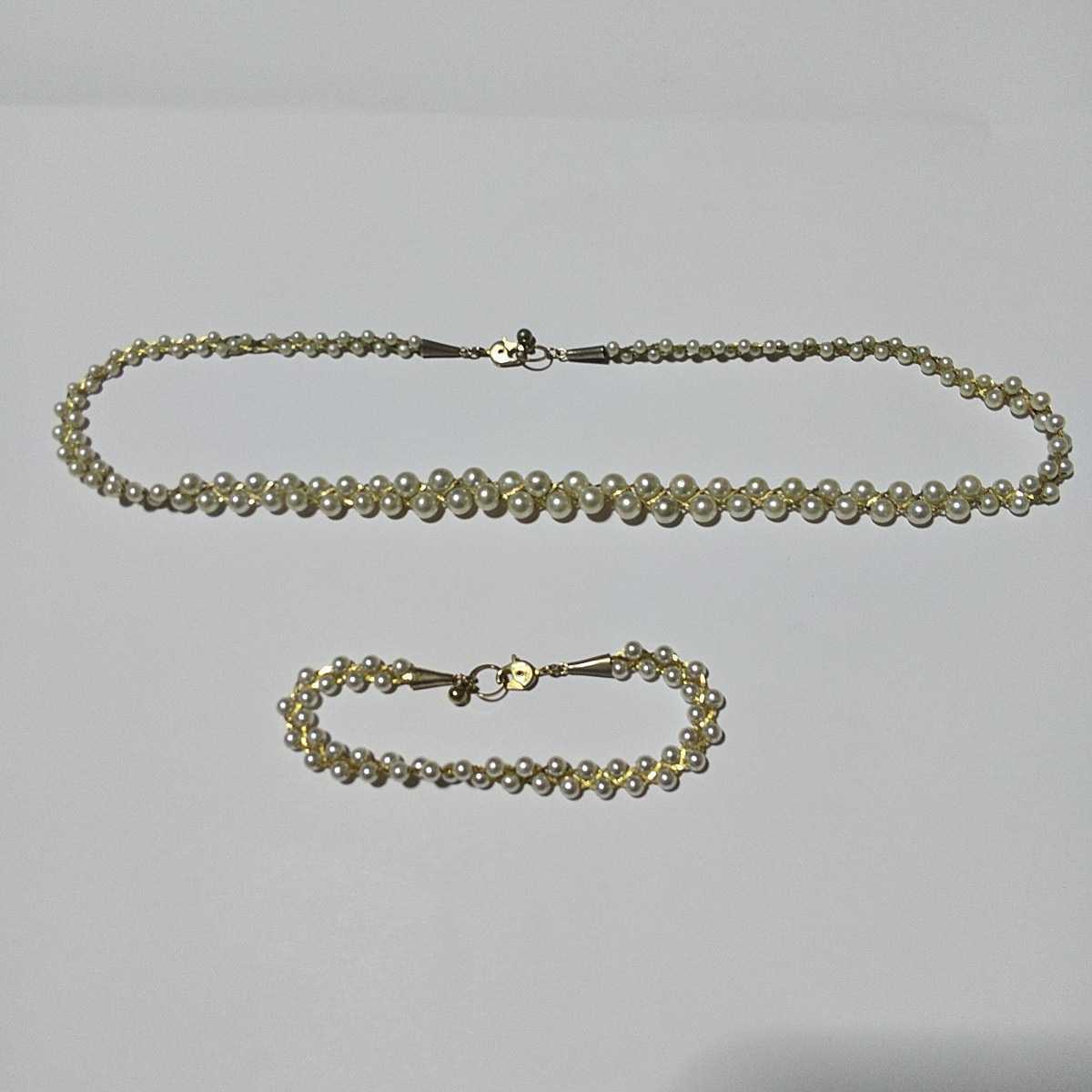 ゴールドカラーのチェーンで繋がれたフェイクパールのラインが美しい、上品で素敵なネックレス&ブレスレットのセットです。