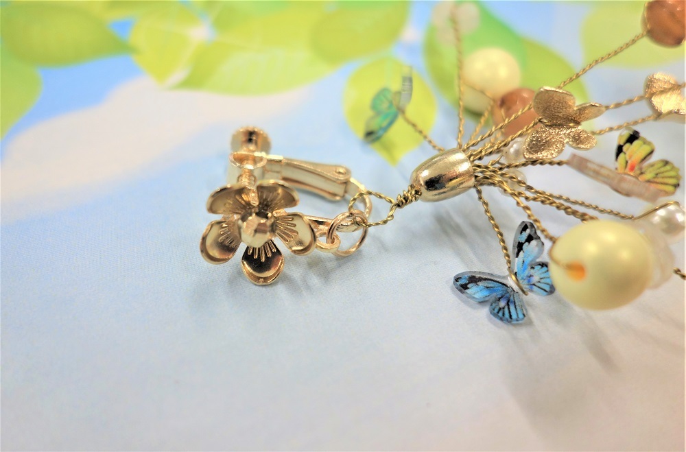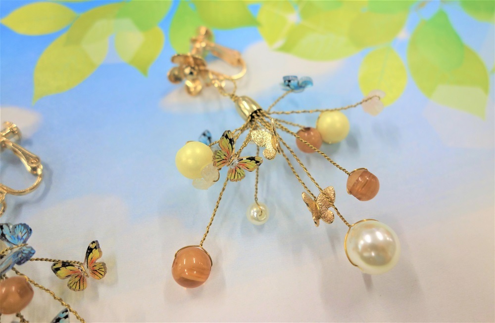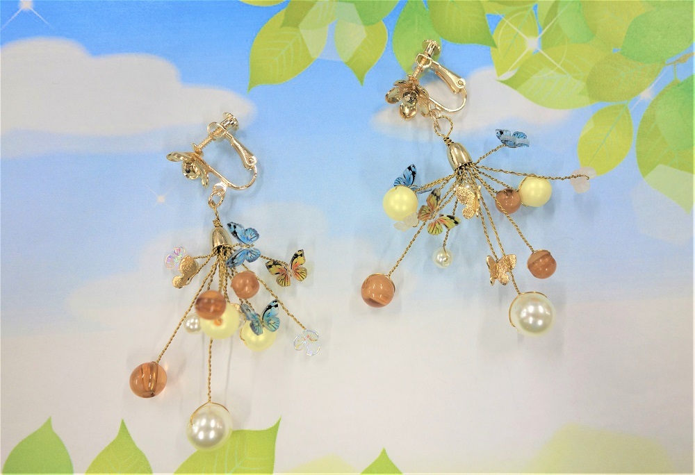 【小枝タッセルイヤリング/蝶々1】送料無料/ハンドメイドアクセサリー/ハンドメイドピアス