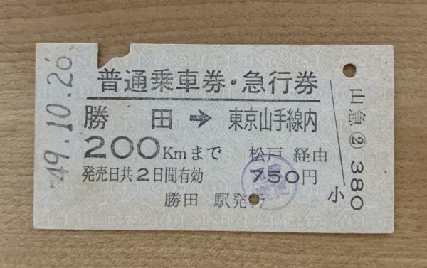 硬券 201 普通乗車券・急行券 常磐線 勝田→東京山手線内 750円券 昭和49年 NO.3592