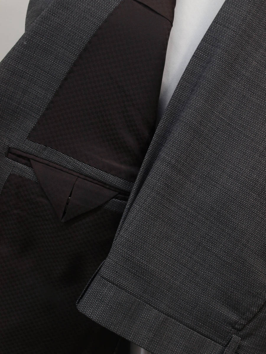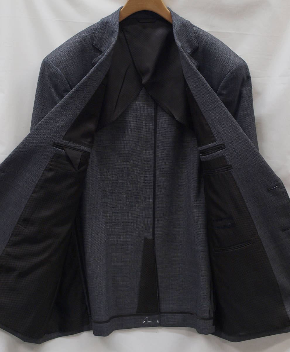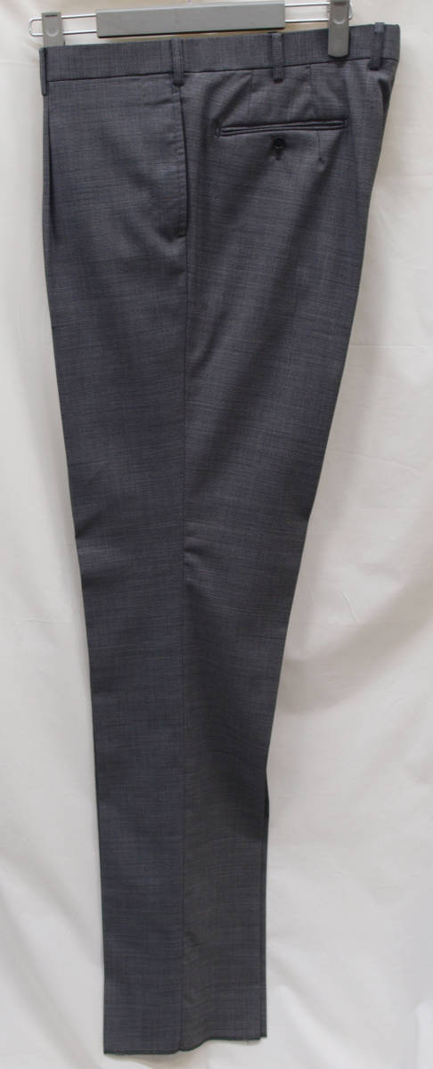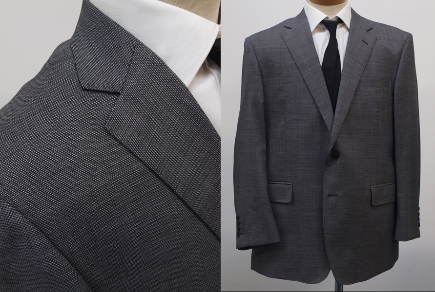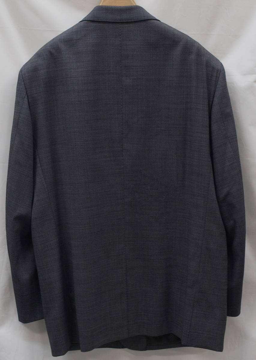 【サイズ】 E8(EXL号サイズ相当) 目安の体型 身長180cm~190cm、ウエストサイズ106cm前後 【ジャケット実寸】 肩幅52.5cm 着丈79.5cm 袖丈63.5cm 脇下部分60cm 身幅58.5cm 【パンツ実寸】 ウエスト(胴回り実寸)106cm わたり幅37cm(股下10cmの部位で34cm) 裾幅23cm 脇股上30.5cm 前股上32cm 股下97cm(裾上げしていない状態/新品) 【素材】 表地:ウール30% ポリエステル70% 裏地:胴裏/ポリエステル100% 袖裏/キュプラ100% 盛夏スーツ生地と比べるとやや厚みがあり、冬向けより薄手の紳士スーツ用ウールブレンド素材を使用 【色】 ミックスグレー 【柄】 黒色と白にちかい薄グレー使いのピンヘッド織柄 秋冬メインのシーズン対応商品ですが、秋冬物としては薄手の素材で背抜き仕様となっておりご着用の地域にもよりますが真夏、真冬を除くほぼオールシーズン対応のテンマンススーツです。 【デザイン】 ほどよいゆとりのある楽な着心地のシングル2つボタンスーツ、レギュラーフィット、ビジネススーツ新品、裾上げしていない状態です。 ・ジャケットはシングル2つボタンですっきりとしたシルエットですがややゆとりがある着用感のベーシックレギュラーモデル ・パンツは股上は浅くなく普通で、適度なゆとりをもたせたレギュラーフィット、1タックパンツ 【縫製仕様】 ・ジャケットはシングル2つボタン、ノッチドラペル、襟縁等AMFステッチ入り、袖口ボタン4つ、センターベント、内ポケット4つ(小ポケット2つ含む)、背抜き仕様 ・パンツはワンタック、膝裏当て付き、脇ポケット斜め付け、後ろポケット両玉縁で左のみボタン付き、フロントはファスナーでボタン&ホック仕様/うちかけボタンあり きれいな縫製仕立てできちんとしたビジネススーツの仕様で仕上がっております。