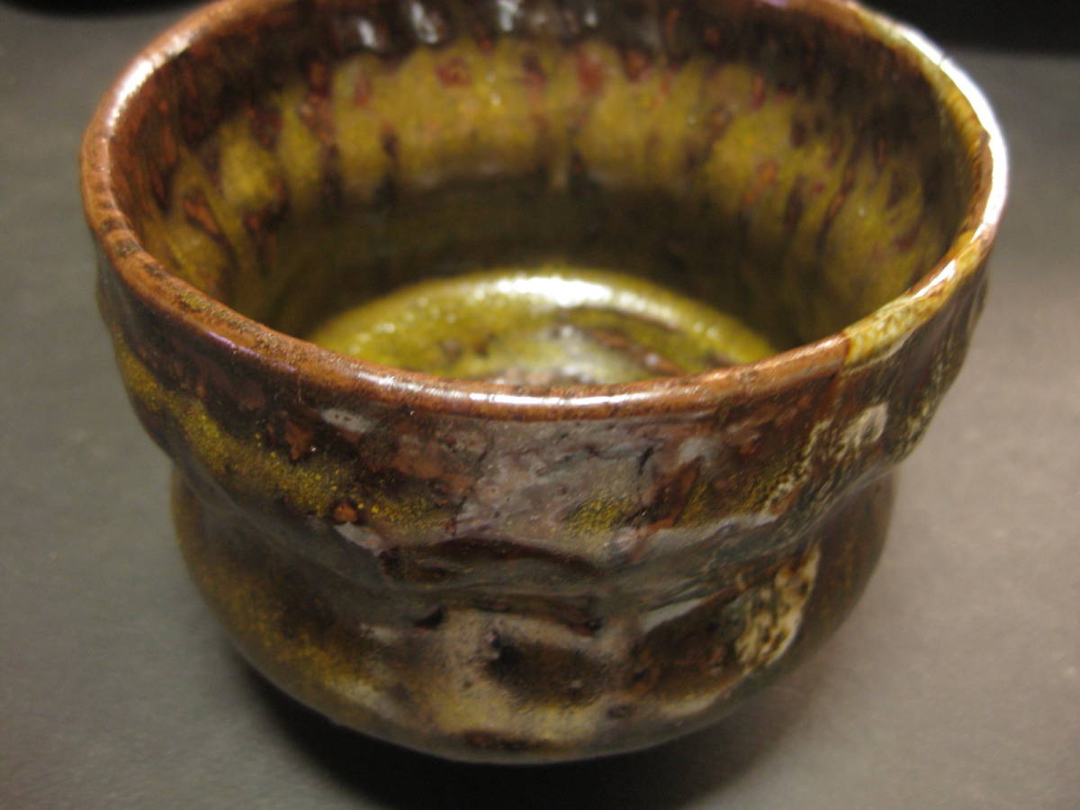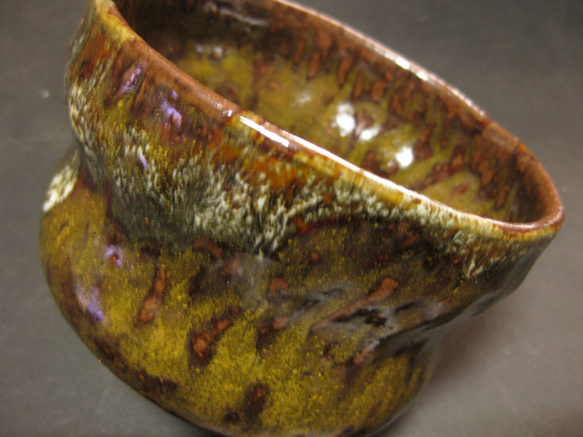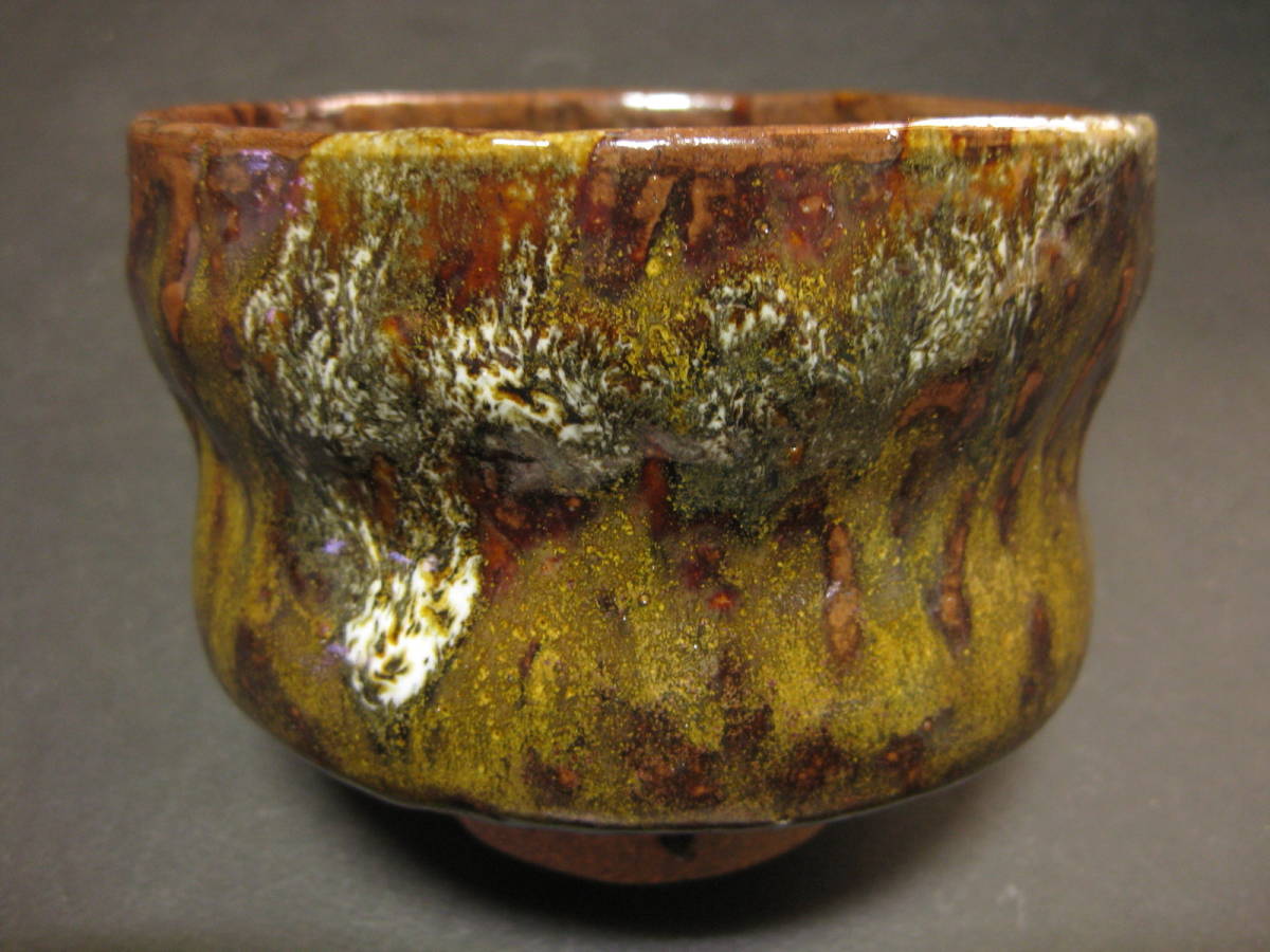 確かな造形力に裏打ちされた不定型な形状といい、様々な色彩が各々の美しさを競うように調和している逸品の沓形茶碗です。