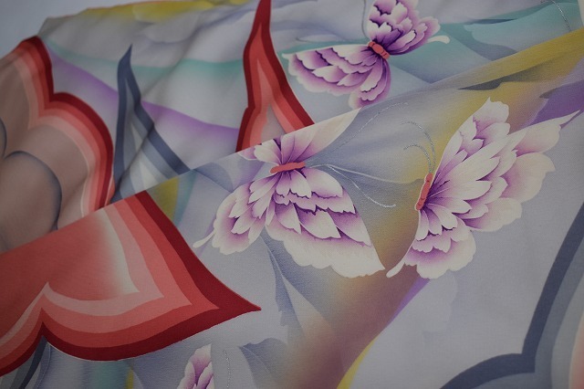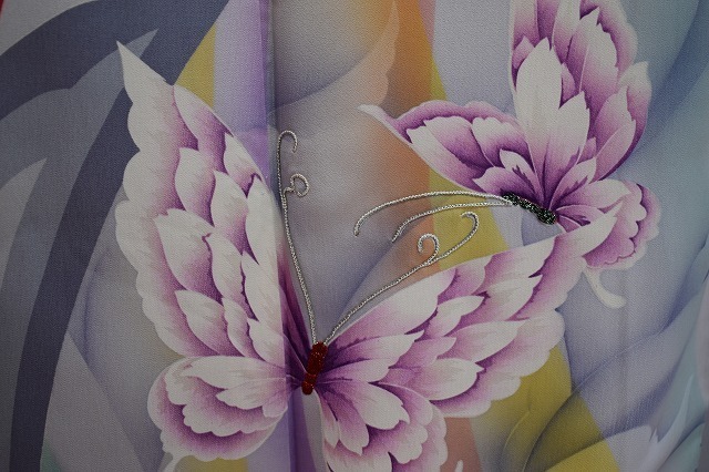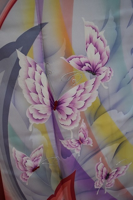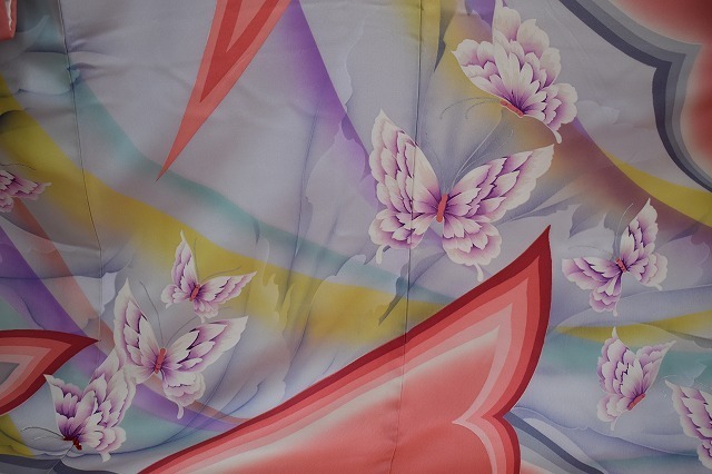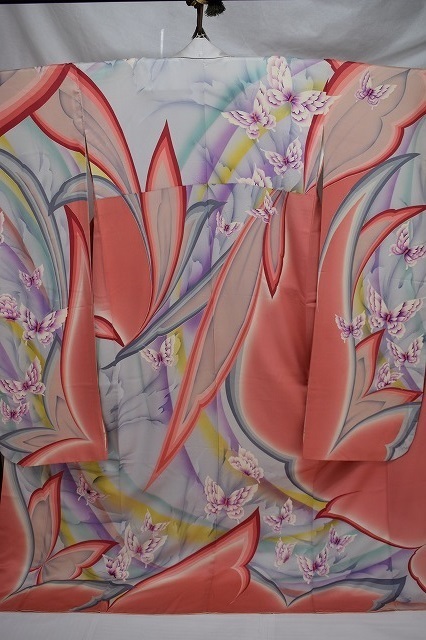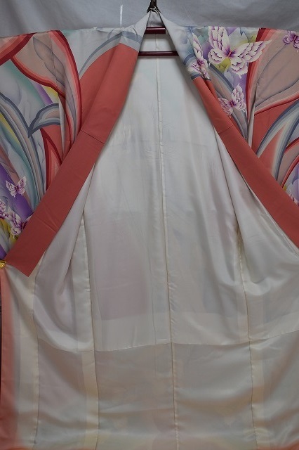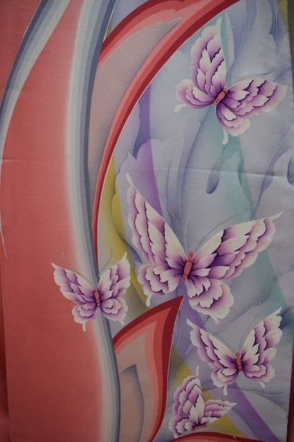 成人式に!振袖 正絹 サーモンピンク 蝶 袷着物 広衿 中古 身丈164cm fuso3★喜香★