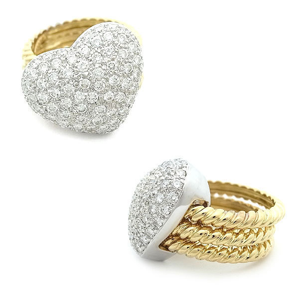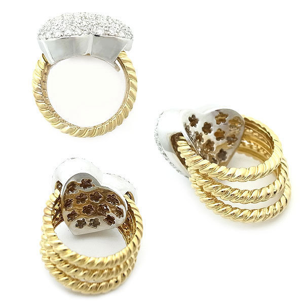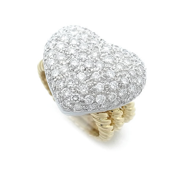コメント 螺旋状にデザインされたイエローゴールドの3本のリングにトータル1.70ctのダイヤモンドが贅沢に敷き詰められたふっくらとしたホワイトゴールドのハートモチーフ。どの角度から見てもダイヤモンドが眩く輝く可愛らしいリングです。ハートが斜めにデザインされてるのも魅力です。
