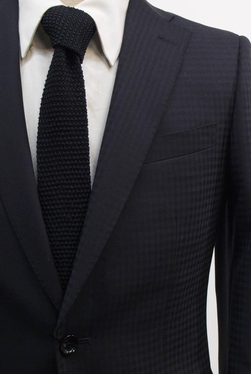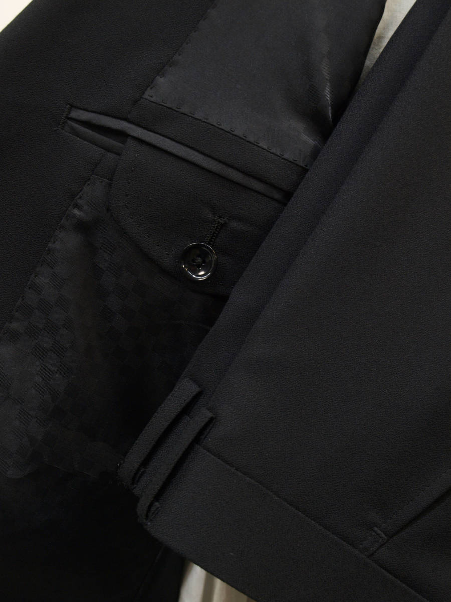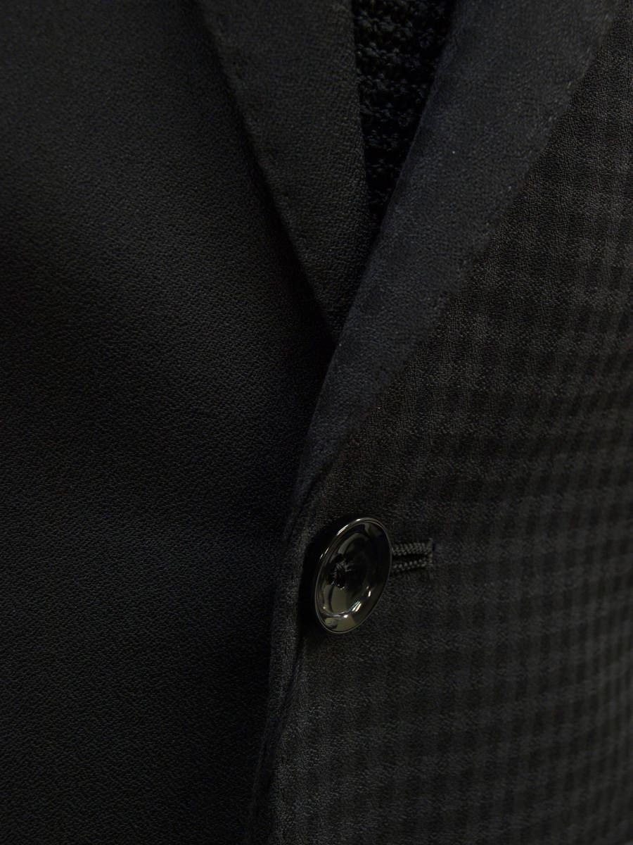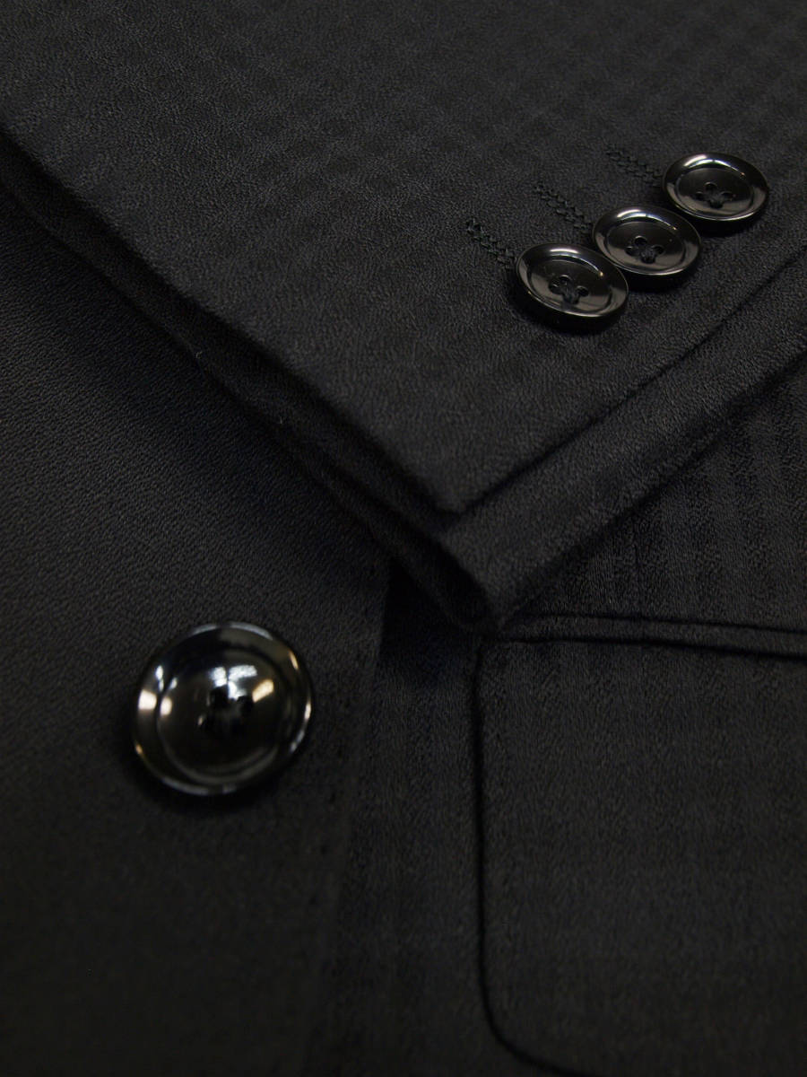 【サイズ】 Y5 (YM サイズ相当) 目安の体型 身長165cm~175cm、ウエストサイズ76cm前後 【ジャケット実寸】 肩幅43cm 着丈70cm 袖丈60.5cm 脇下部分47cm 身幅42.5cm 【パンツ実寸】 ウエスト(胴回り実寸)76cm (平置きでかるくはかると76cmでひっぱってはかると79cmです。股上が浅いため2~3cmほど実寸が大きくなります。) わたり幅29.5cm(股下10cmの部位で27cm) 裾幅19cm 脇股上22cm 前股上24cm 股下90cm(裾上げしていない状態/新品) 【素材】 表地:ウール50% ポリエステル50% 裏地:胴裏/ポリエステル100% 袖裏/ポリエステル100% 真夏向けの生地より少し厚みのあるやや薄手くらいの紳士スーツ用ウールブレンド素材です。 【色】 黒色 【柄】 無地とシャドウチェック柄 【デザイン】 コンパクトな印象の細身ですっきりとしたシルエット、タイトフィットスリム、デザインスーツ新品、裾上げしていない状態です。 前から見ると右身頃(袖含めて)は黒色無地、左身頃(袖含めて)はシャドーチェック柄の別柄使いのスーツです。背中、上襟、パンツは黒色無地です。 ・ジャケット:シングル2つボタンでスリムモデル ・パンツの股上は浅く細いシルエットのノータックスリムテーパードパンツ 厚手ではない素材でご着用の地域にもよりますが真冬を除くほぼオールシーズン対応商品 【縫製仕様】 ・ジャケットはシングル2つボタン、ノッチドラペル、襟縁等AMFステッチ入り、袖口ボタン3つ、センターベント、内ポケット4つ(小ポケット2つ含む)、背抜き(春夏秋/通年物) ・パンツはノータック、膝裏当て付き、脇ポケット斜め付け、後ろポケット両玉縁で左のみボタン付き、フロントはファスナーでボタン&ホック仕様/うちかけボタンあり、 細部にわたりきちんとしたビジネス仕様の縫製仕立てで仕上がっております。