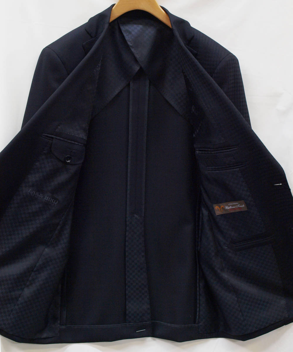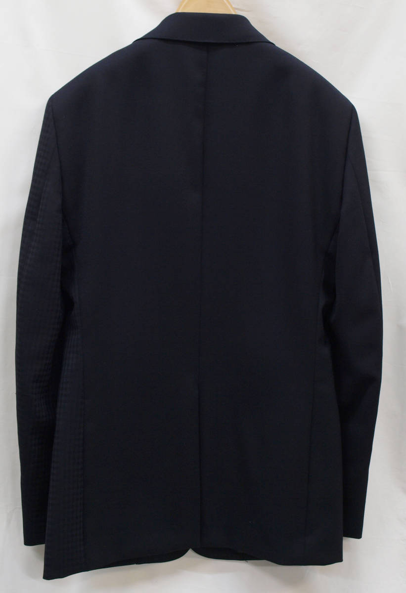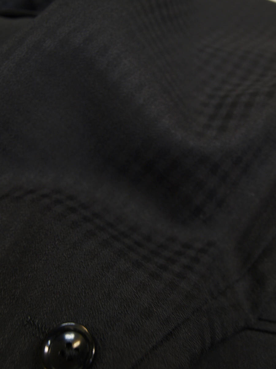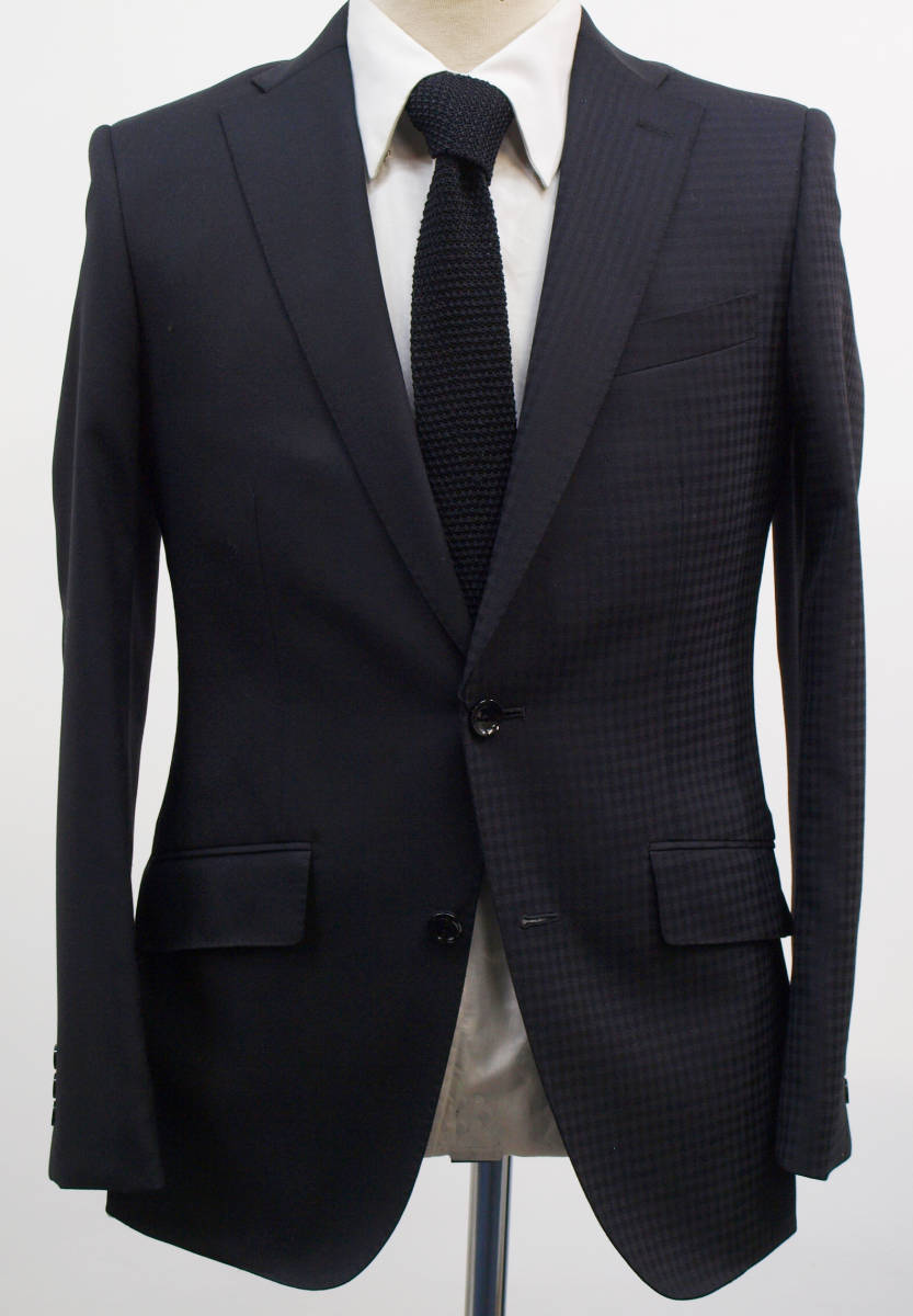 【サイズ】 Y5 (YM サイズ相当) 目安の体型 身長165cm~175cm、ウエストサイズ76cm前後 【ジャケット実寸】 肩幅43cm 着丈70cm 袖丈60.5cm 脇下部分47cm 身幅42.5cm 【パンツ実寸】 ウエスト(胴回り実寸)76cm (平置きでかるくはかると76cmでひっぱってはかると79cmです。股上が浅いため2~3cmほど実寸が大きくなります。) わたり幅29.5cm(股下10cmの部位で27cm) 裾幅19cm 脇股上22cm 前股上24cm 股下90cm(裾上げしていない状態/新品) 【素材】 表地:ウール50% ポリエステル50% 裏地:胴裏/ポリエステル100% 袖裏/ポリエステル100% 真夏向けの生地より少し厚みのあるやや薄手くらいの紳士スーツ用ウールブレンド素材です。 【色】 黒色 【柄】 無地とシャドウチェック柄 【デザイン】 コンパクトな印象の細身ですっきりとしたシルエット、タイトフィットスリム、デザインスーツ新品、裾上げしていない状態です。 前から見ると右身頃(袖含めて)は黒色無地、左身頃(袖含めて)はシャドーチェック柄の別柄使いのスーツです。背中、上襟、パンツは黒色無地です。 ・ジャケット:シングル2つボタンでスリムモデル ・パンツの股上は浅く細いシルエットのノータックスリムテーパードパンツ 厚手ではない素材でご着用の地域にもよりますが真冬を除くほぼオールシーズン対応商品 【縫製仕様】 ・ジャケットはシングル2つボタン、ノッチドラペル、襟縁等AMFステッチ入り、袖口ボタン3つ、センターベント、内ポケット4つ(小ポケット2つ含む)、背抜き(春夏秋/通年物) ・パンツはノータック、膝裏当て付き、脇ポケット斜め付け、後ろポケット両玉縁で左のみボタン付き、フロントはファスナーでボタン&ホック仕様/うちかけボタンあり、 細部にわたりきちんとしたビジネス仕様の縫製仕立てで仕上がっております。
