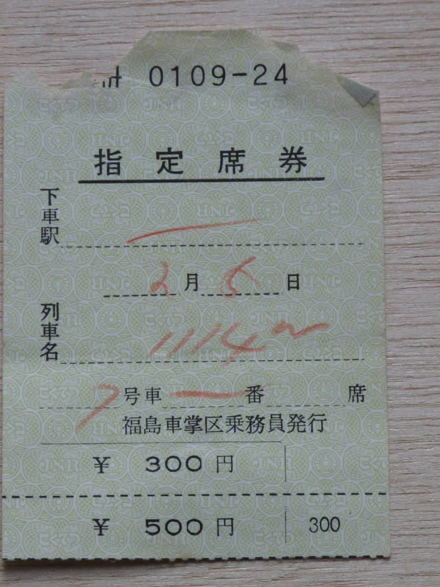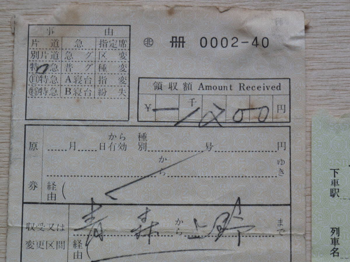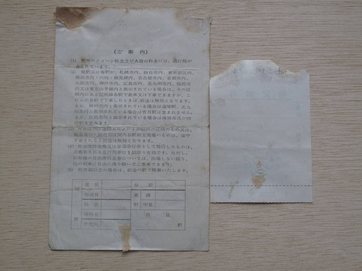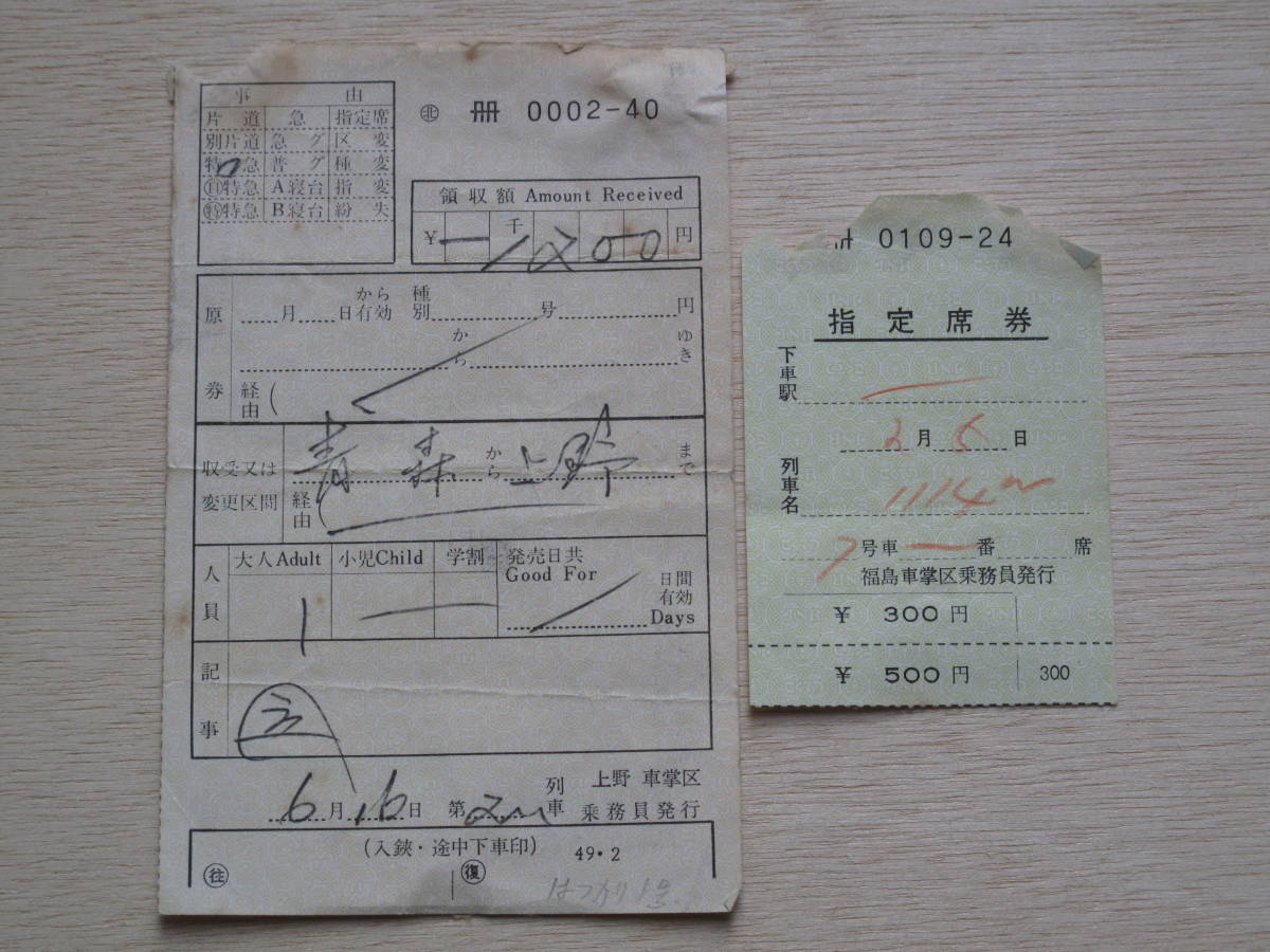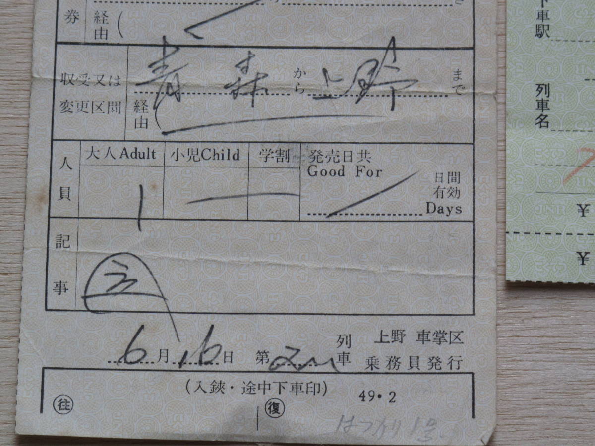 昭和49~50年代前半に発行された、国鉄 東北 特急券1枚 指定席券1枚 計2枚 です。 ① 昭和49年2月の日付のある、上野車掌区乗務員の発行した、青森駅から 上野駅ゆきの はつかり1号 特急券 1200円券です。「立」の記入。左端にミシン目。裏面に5項目の注意書きと精算欄。 ② 昭和50年代前半、福島車掌区乗務員の発行した、1114M列車の 指定席券 500円券です。下端にミシン目。「2月5日」の記入。裏面は白紙。 ①が黄土色地、②が淡緑地で「JNR」「こくてつ」地紋。軟券。 サイズは①がタテ12.6cm×ヨコ8.1cm、②が7.5cm×5.2cm。 いずれも経年の変色・薄い汚れ・折れ・上端に欠損・薄いシミ・裏面に紙のはがし跡があります。 定形郵便110円でお送りします。 ★保存状態の記述は、あくまで個人的な評価ですので、保存状態に厳しい方は、入札をご遠慮願います。