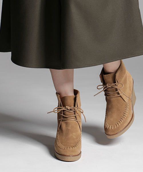 ウェッジソールで安定感があり、快適な履き心地のショートブーツです。 レースアップデザインで足元もスッキリとした印象に。 カジュアルにもフェミニンにも合わせていただける万能な一足です。