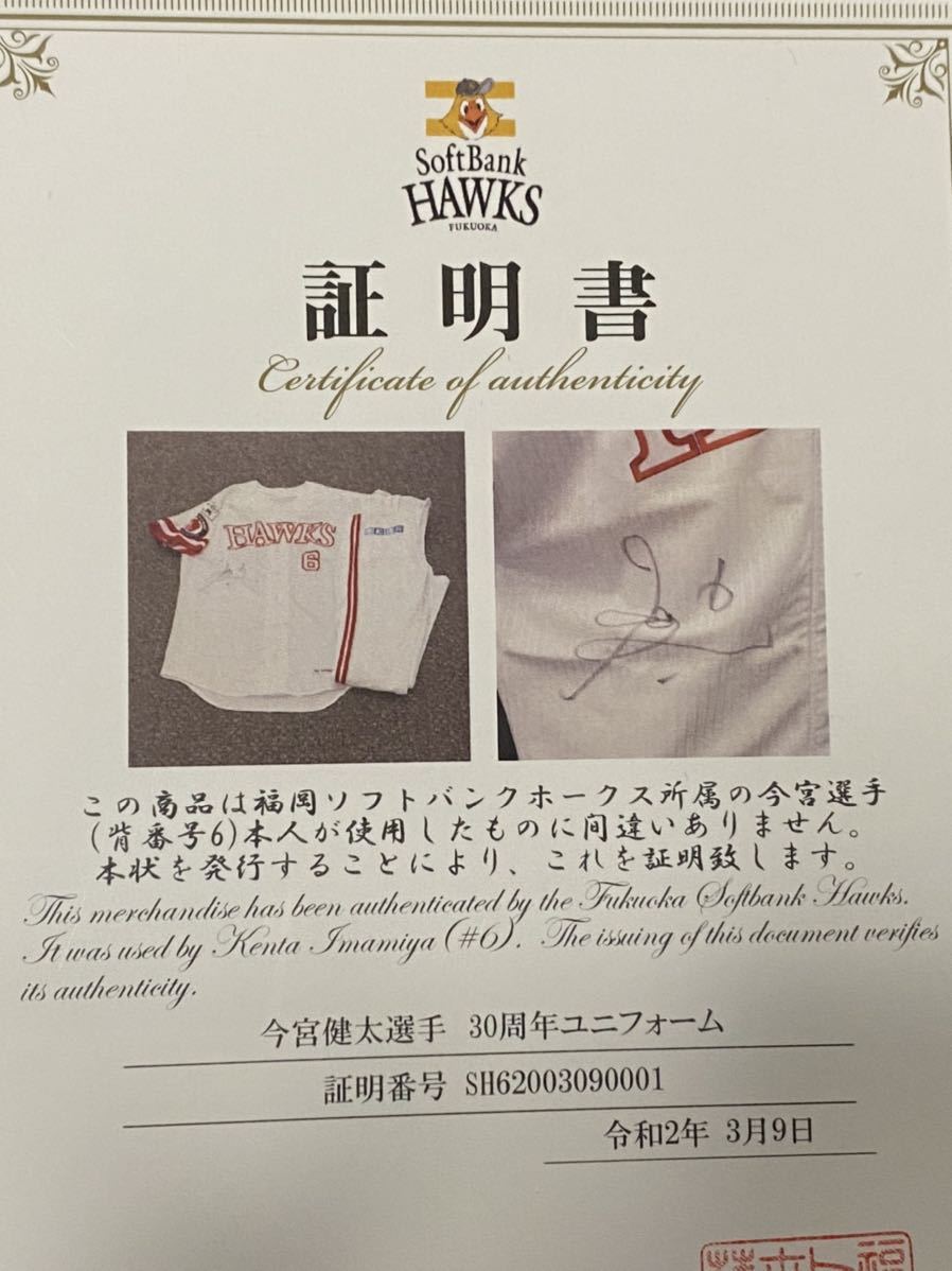 福岡ソフトバンクホークス 2 今宮健太'19シーズン公式戦 鷹の祭典 実使用 直筆サイン入りユニフォーム上下