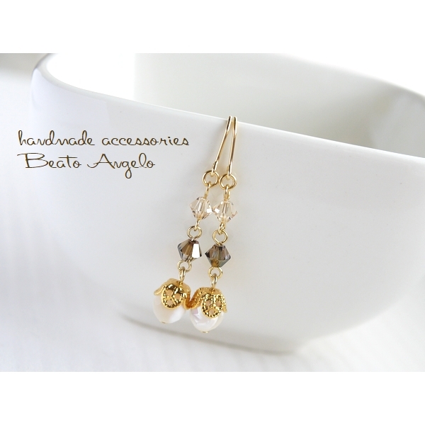 天然石マザーオブパールとスワロフスキーのピアス(p-100)ミルク G
