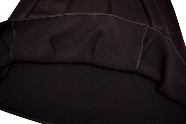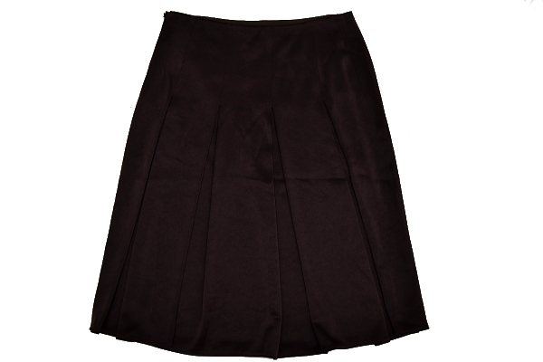 ダークブラウンカラー 後ろプリーツ 膝下スカート ウエスト左横ファスナー 裏地なし 表面光沢 レディース