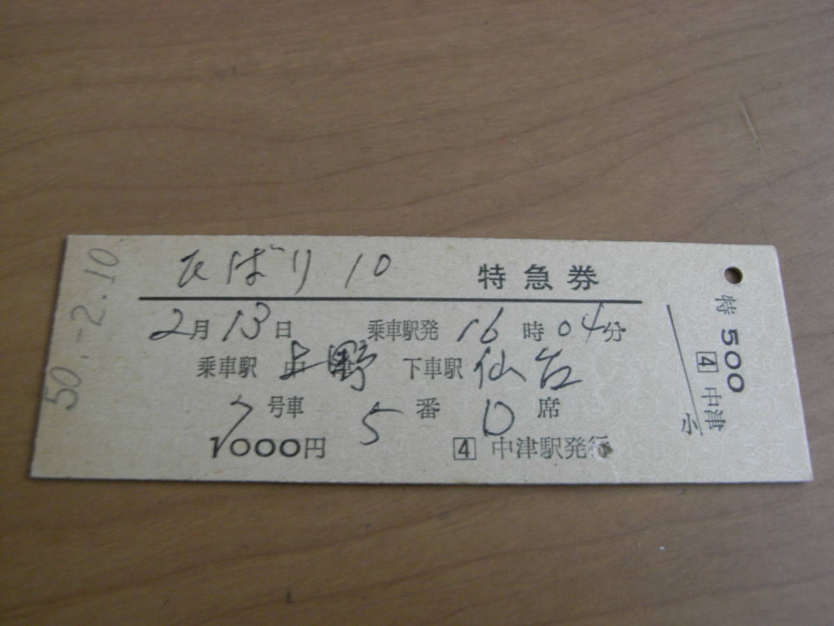 ひばり10 特急券 乗車駅 上野 下車駅 仙台 昭和50年2月10日発行 中津駅発行