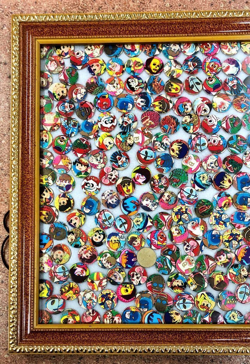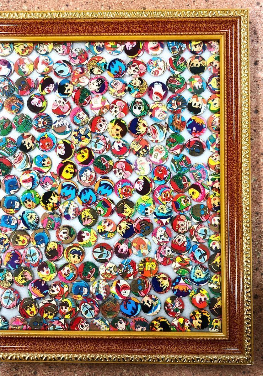 直径約2センチのミニメンコを100枚以上額に入れました。