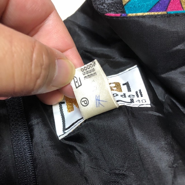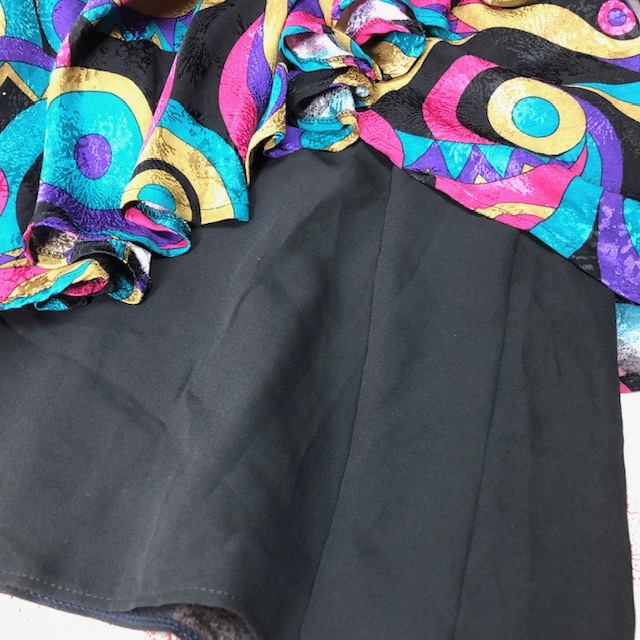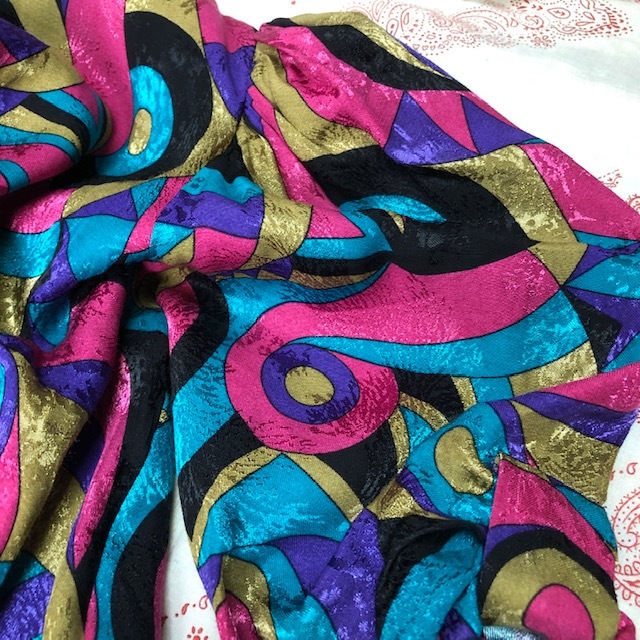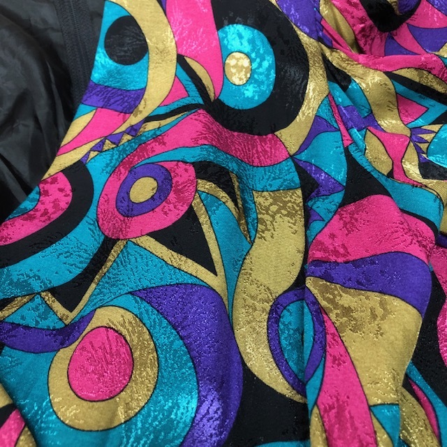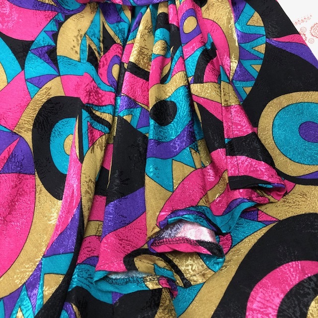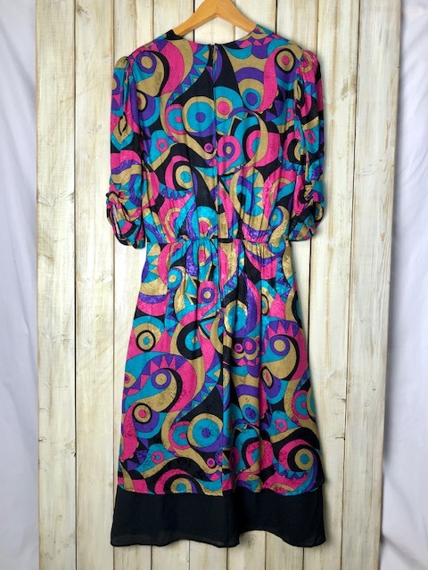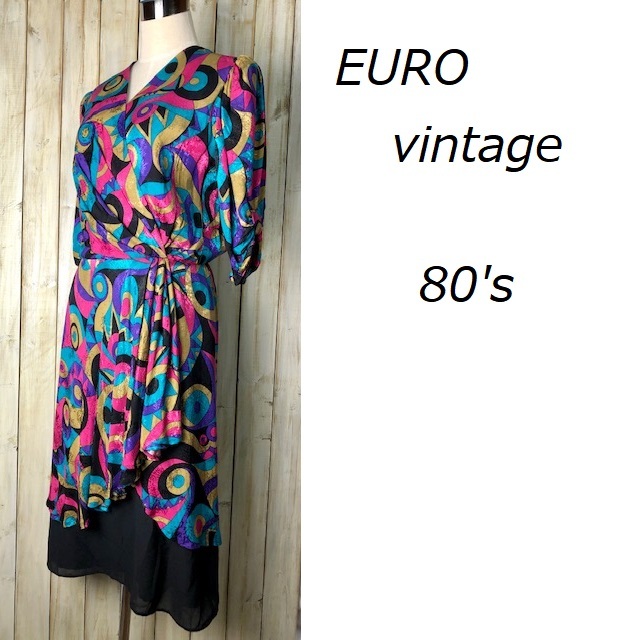 ●商品説明・・・ヨーロッパ古着になります。80年代頃のオールド・ヴィンテージのやや光沢感のあるサイケデリックな幾何学模様のワンピースです。カラフルな柄に加え織にも柄が入っており手の込んだ深みのある一着です。ラップ風のアシンメトリーなシルエットで、裏生地付きになっており、独特なドレープ感もいい雰囲気です。素材はビスコースです。