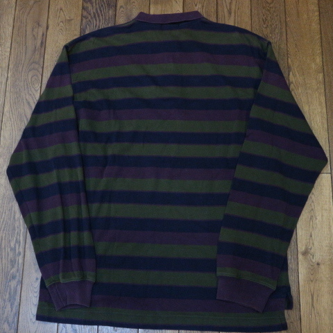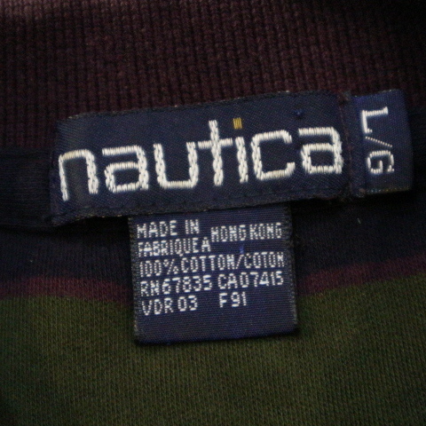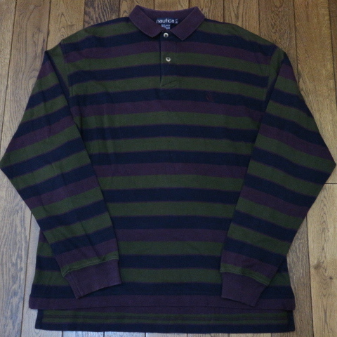90s NAUTICA ボーダー 長袖 ポロシャツ L パープル グリーン ロゴ 刺繍 ラグビー ラガーシャツ スウェット オールド ノーティカ