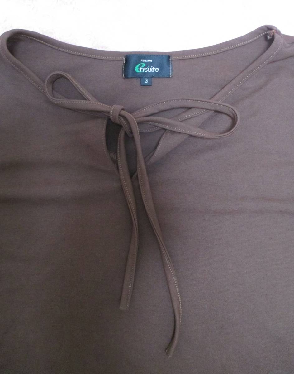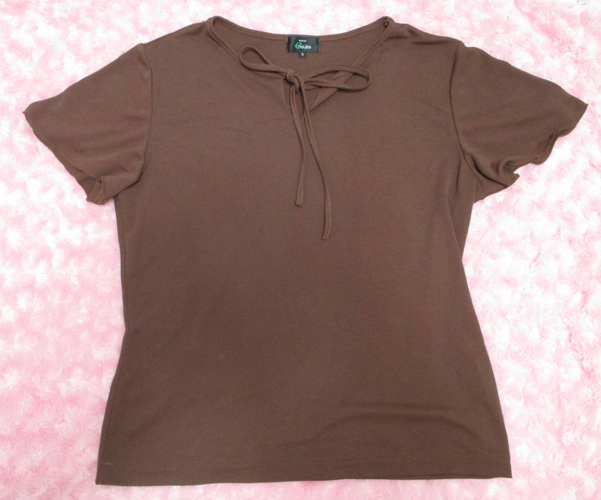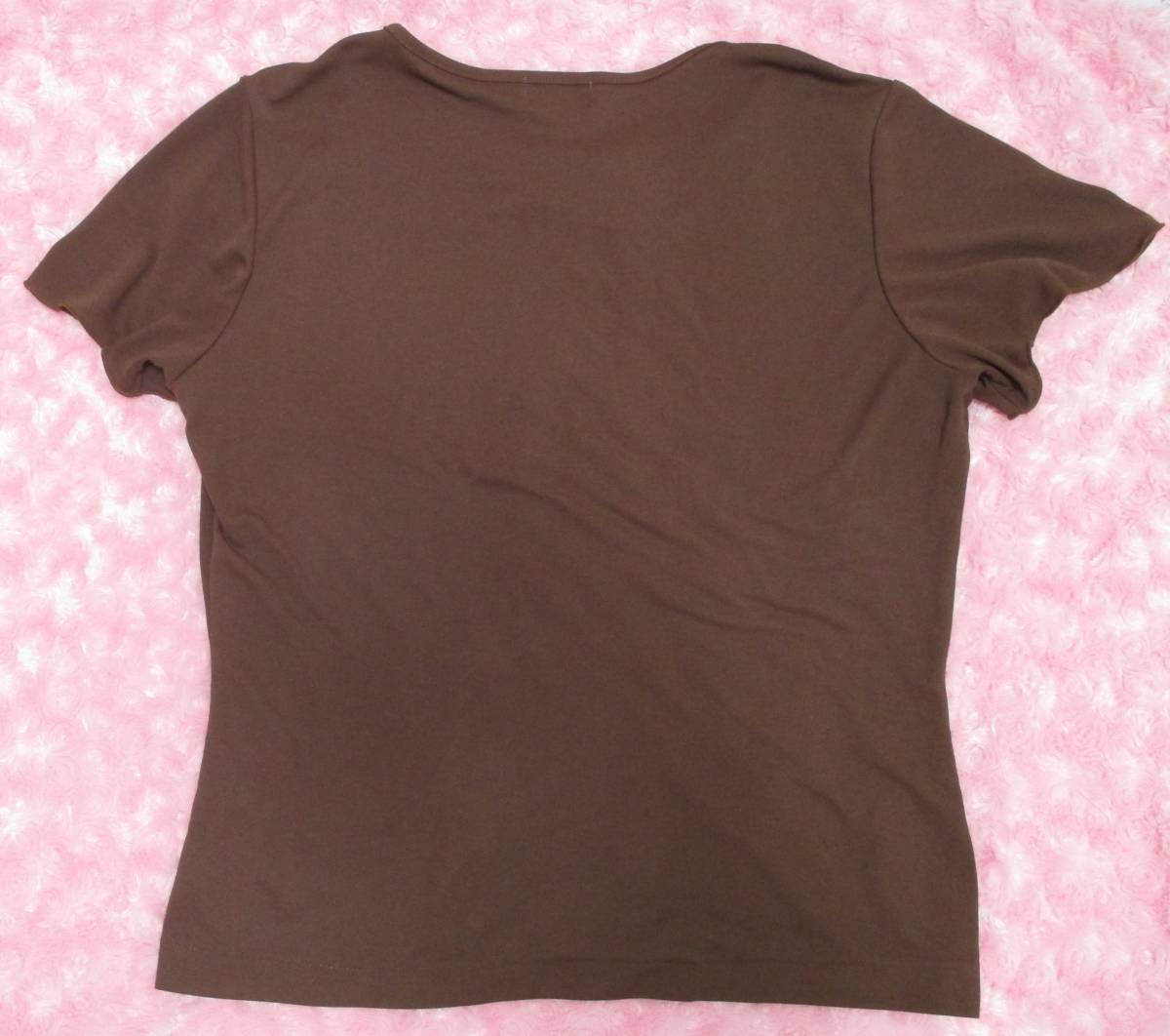 サイズ約 肩幅45,身幅54、袖丈17.5,着丈58cmほどの大きさです。あくまでも個人の主観での美品です。㈱レナウン 濃い茶色半袖リボンタイカットソーensuiteサイズ3大きいサイズ 日本製 ポリエステル100%