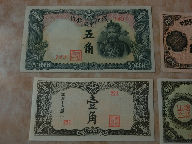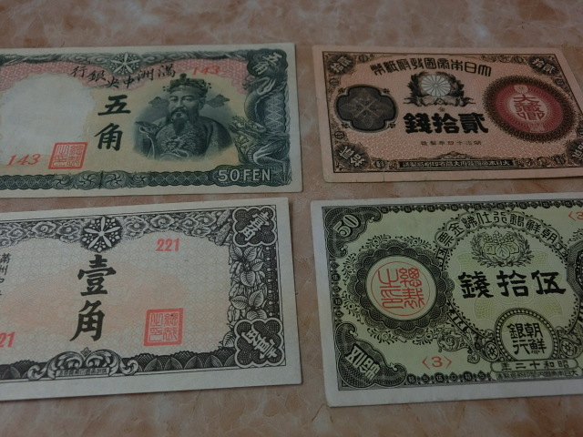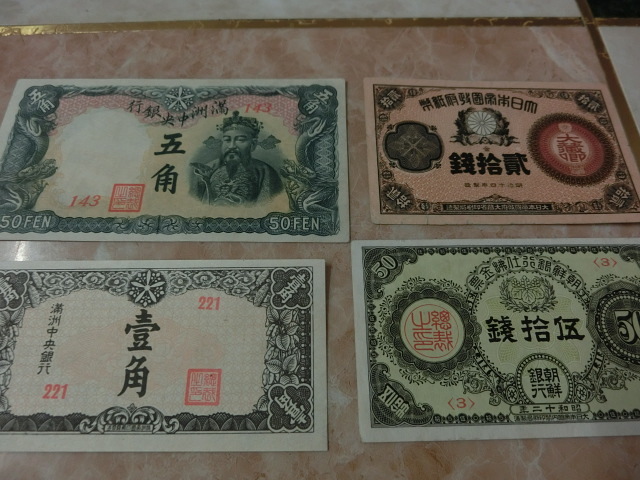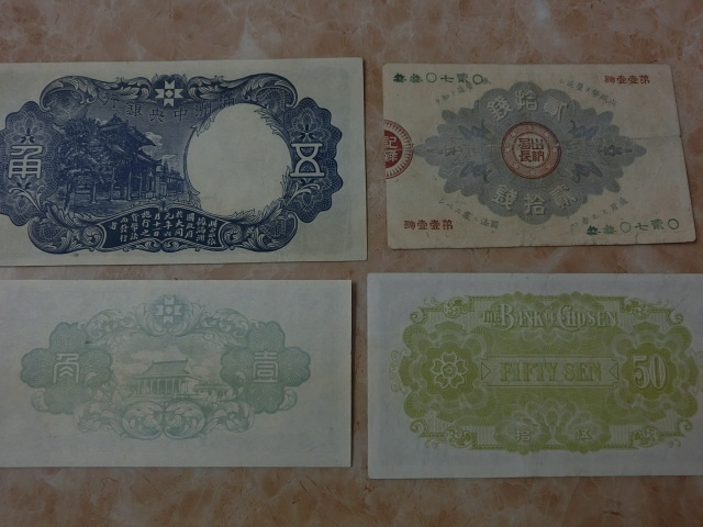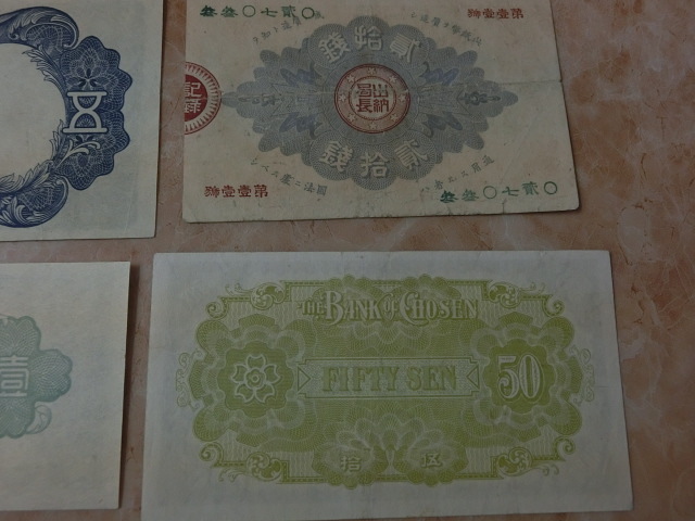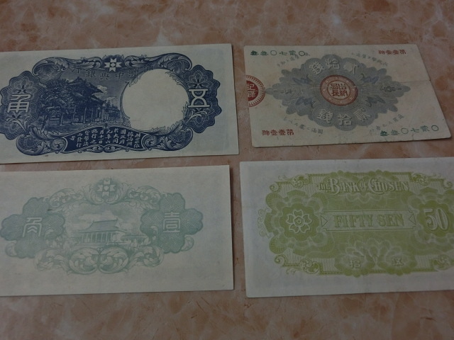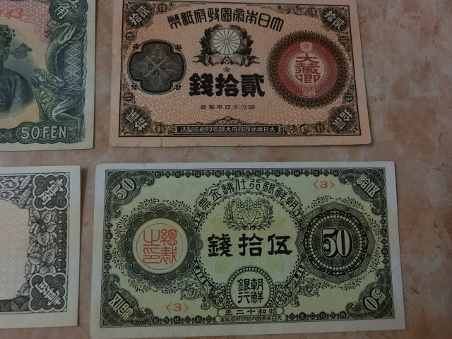 大蔵卿20銭・支払金票50銭票・丙号券1角・丙号券5角の4種4枚セットです。