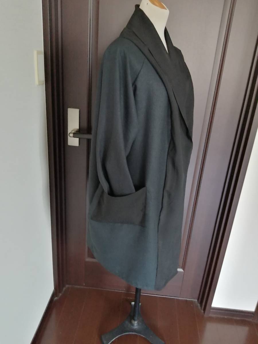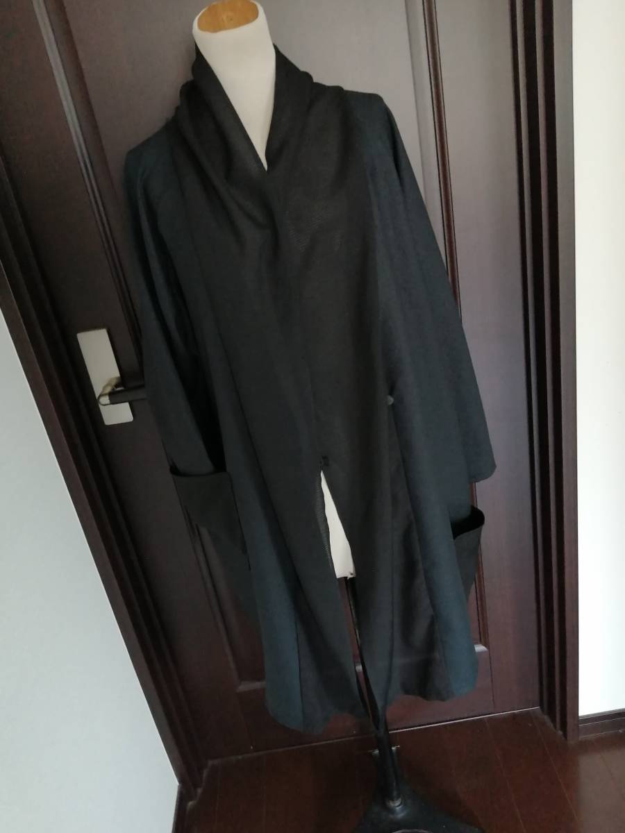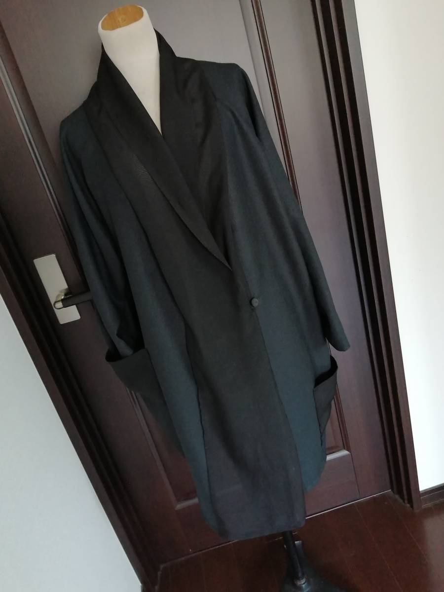 ~4L程度の方迄ご着用頂けます大きいサイズの春夏コートを、ハンドメイド致しました。実寸は身幅65、総丈80程度の七分袖コートになります。新反のリネン混の黒青色の生地と透ける黒絽の着物を解いた着物リメイク品です。くるみボタンを1つ、つけておりますので、ボタンを留めても、ご着用頂けます。ポケット2つ付けました。