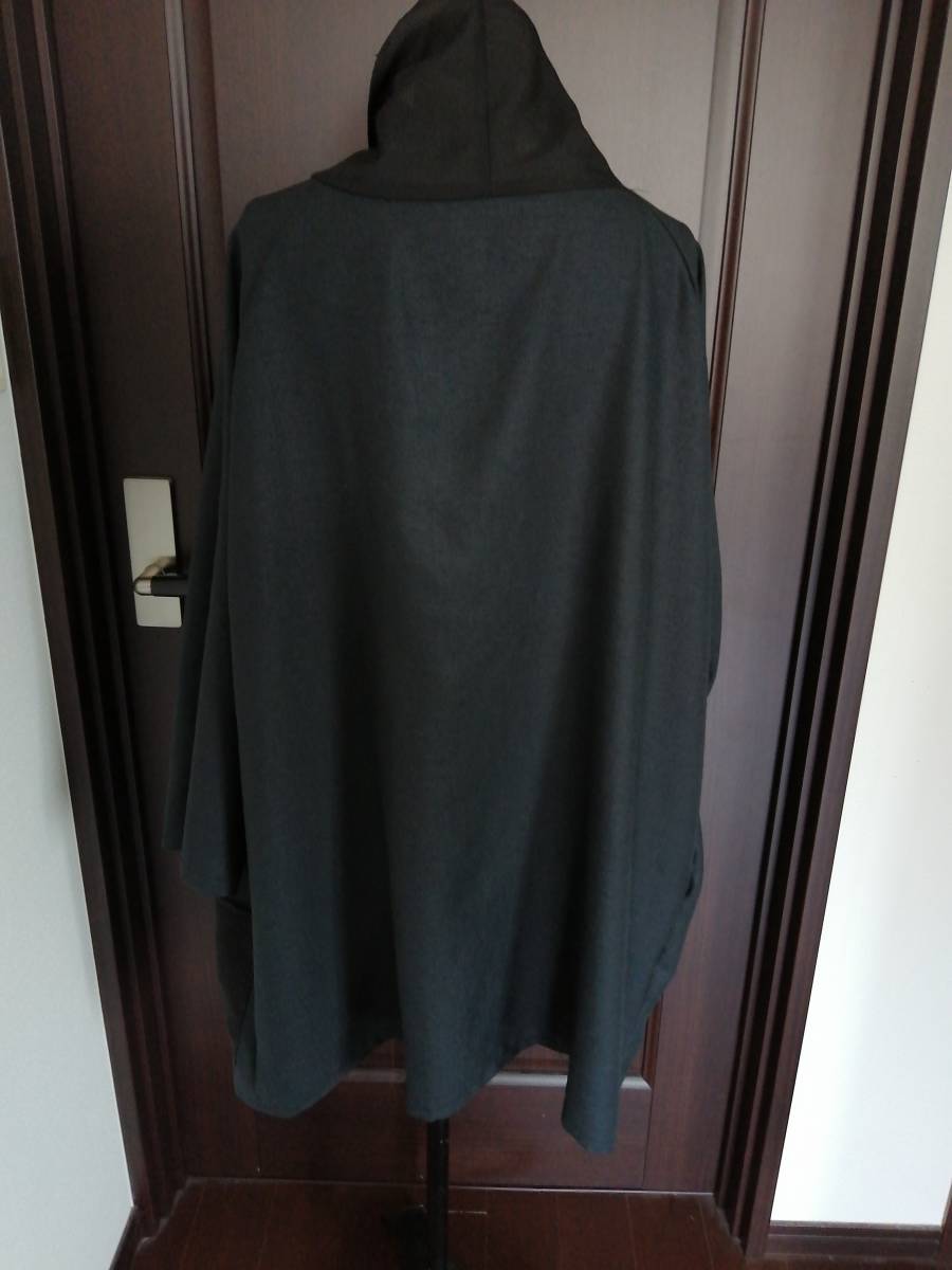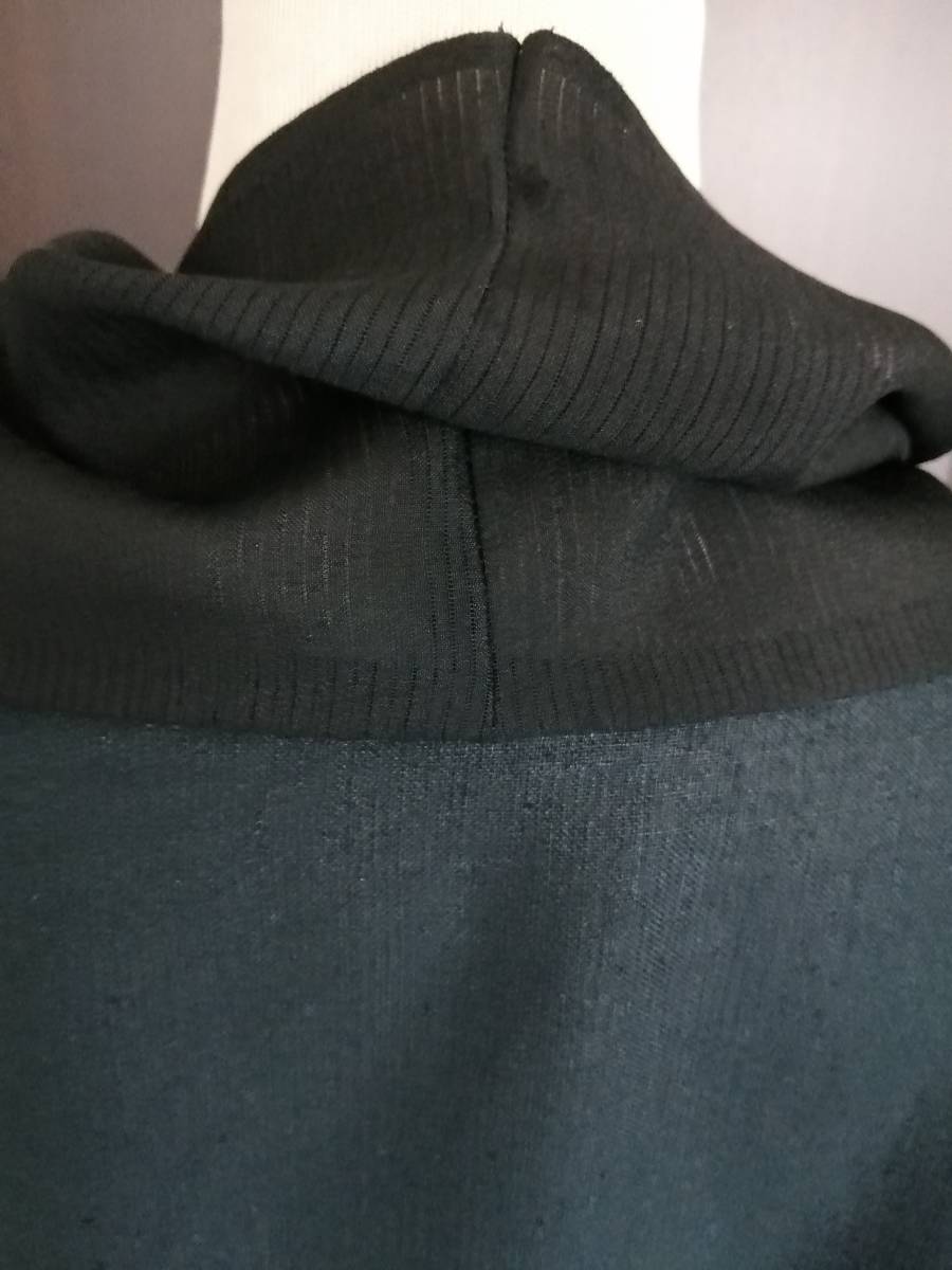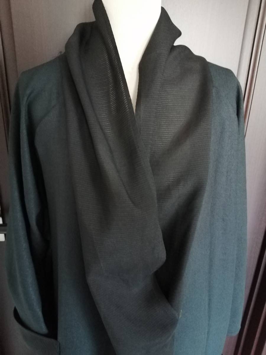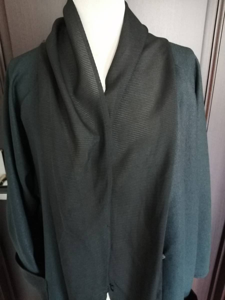 ~4L程度の方迄ご着用頂けます大きいサイズの春夏コートを、ハンドメイド致しました。実寸は身幅65、総丈80程度の七分袖コートになります。新反のリネン混の黒青色の生地と透ける黒絽の着物を解いた着物リメイク品です。くるみボタンを1つ、つけておりますので、ボタンを留めても、ご着用頂けます。ポケット2つ付けました。