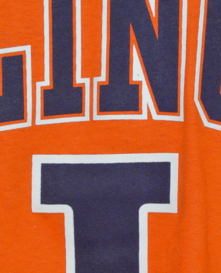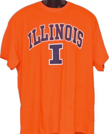 オレンジの生地に、イリノイ大の大学名とチームのロゴがプリントされたTシャツです。