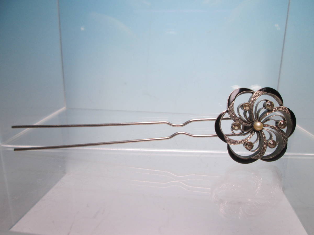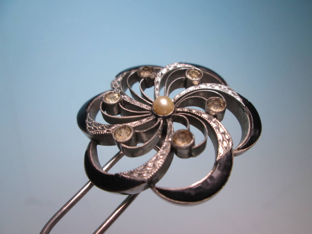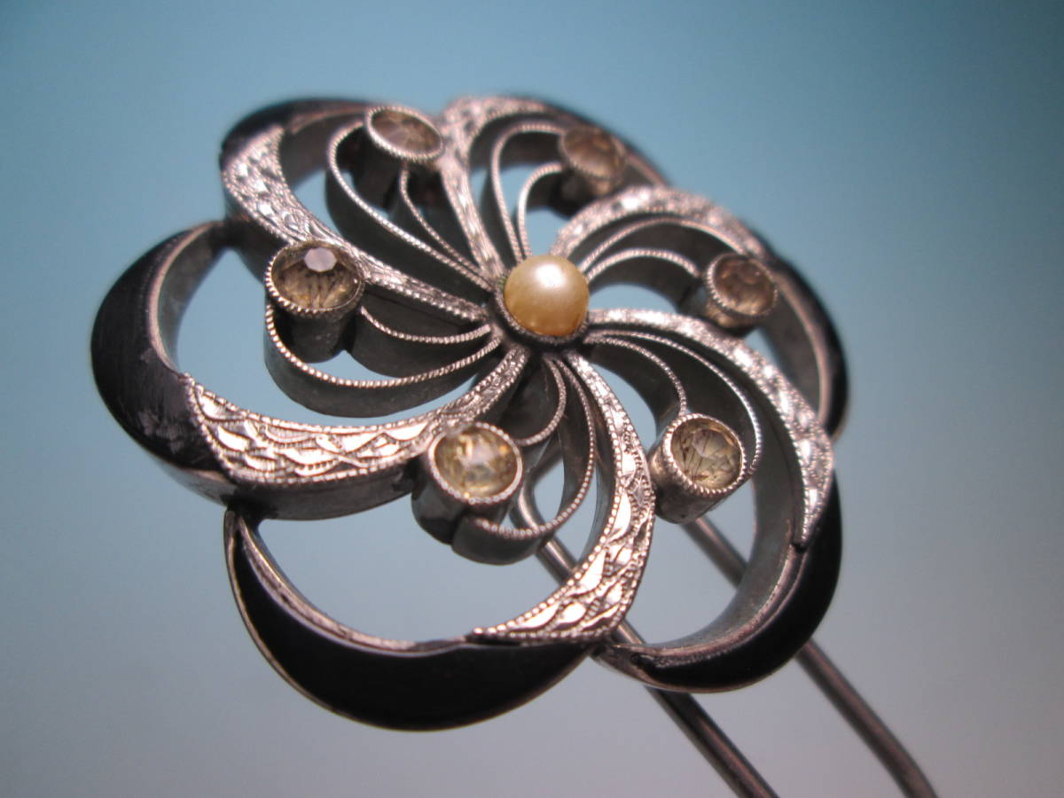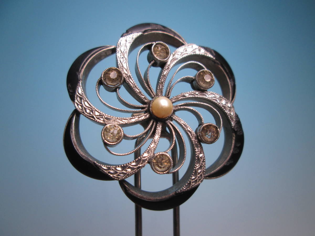 彫金細工にラインストーンと真珠を飾った可愛い簪です。刻印は有りません。